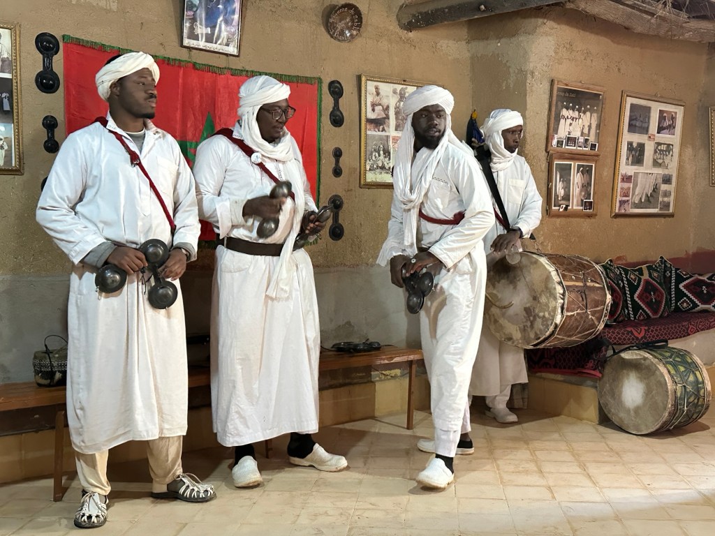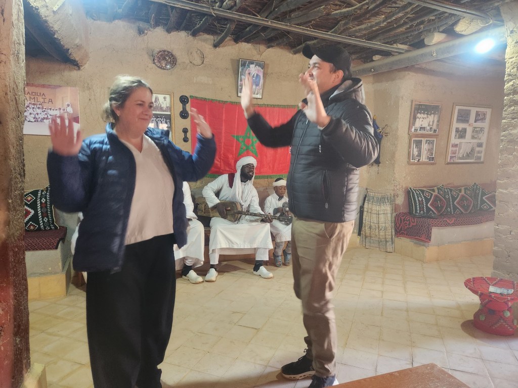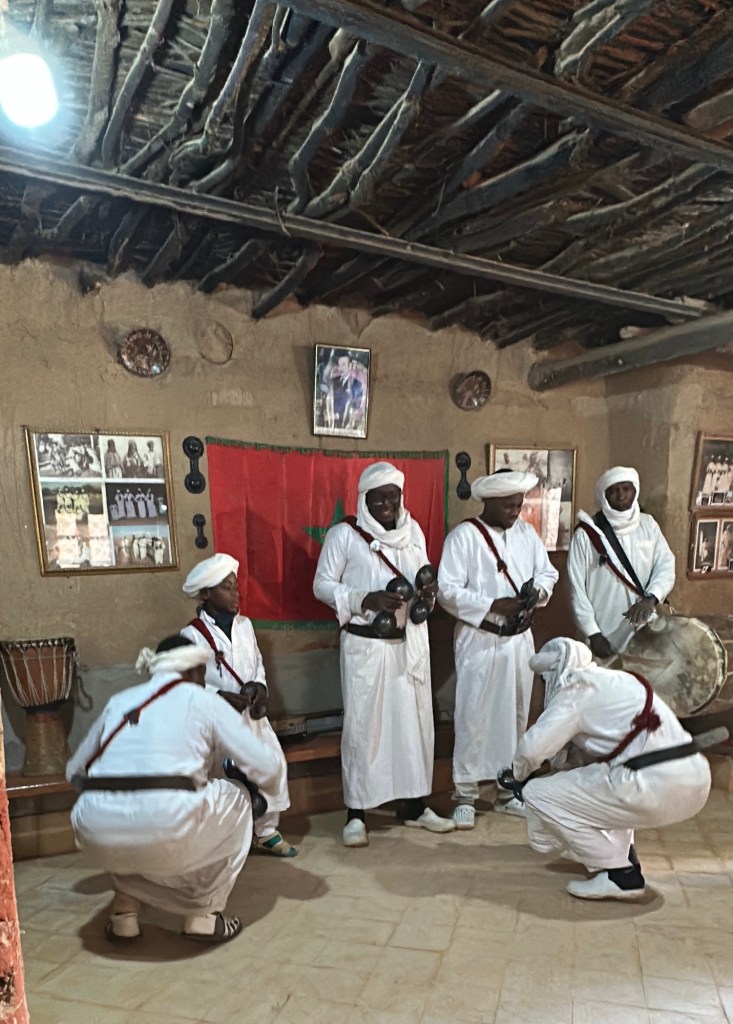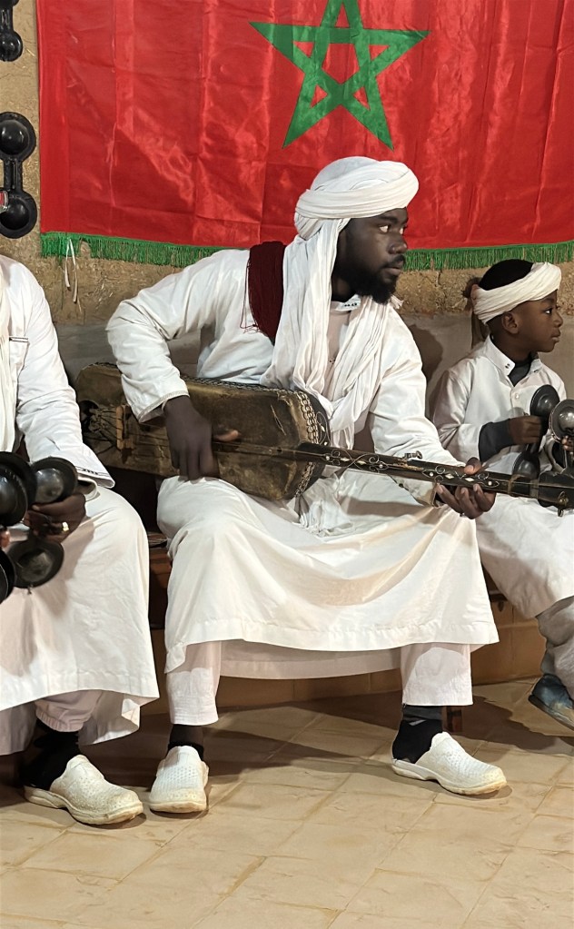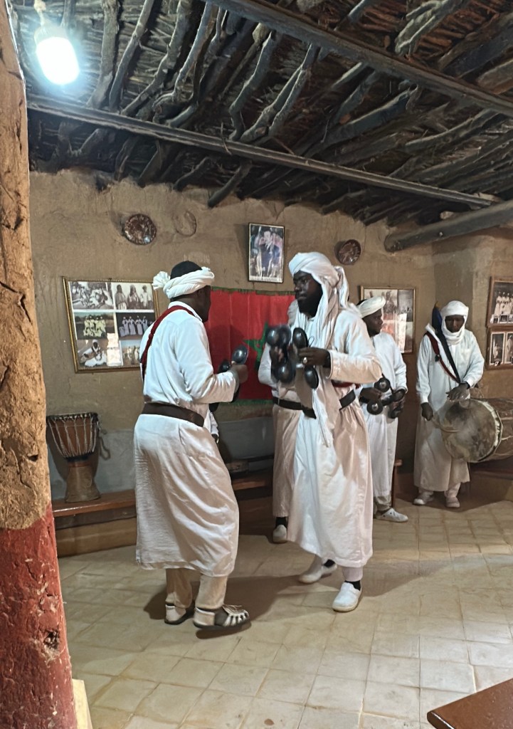 While still hugging the Algerian boarder we visit the community of Khamlia. People here come from other parts of Africa. Residents have specialized in a type of music that has origins from a few different countries; the music skills are passed down to others in the community. A large way Gnaoua musicians survive these days is sharing their music with tourists like us. We enjoy a performance and a few of us break out in dance.