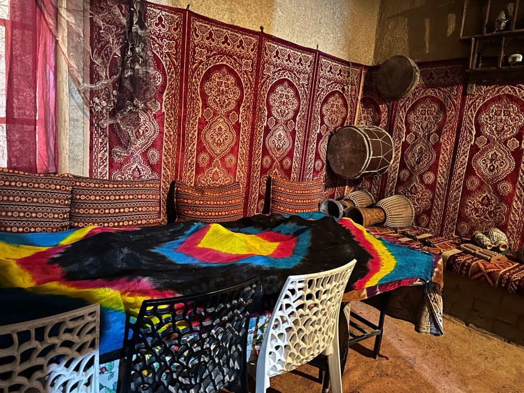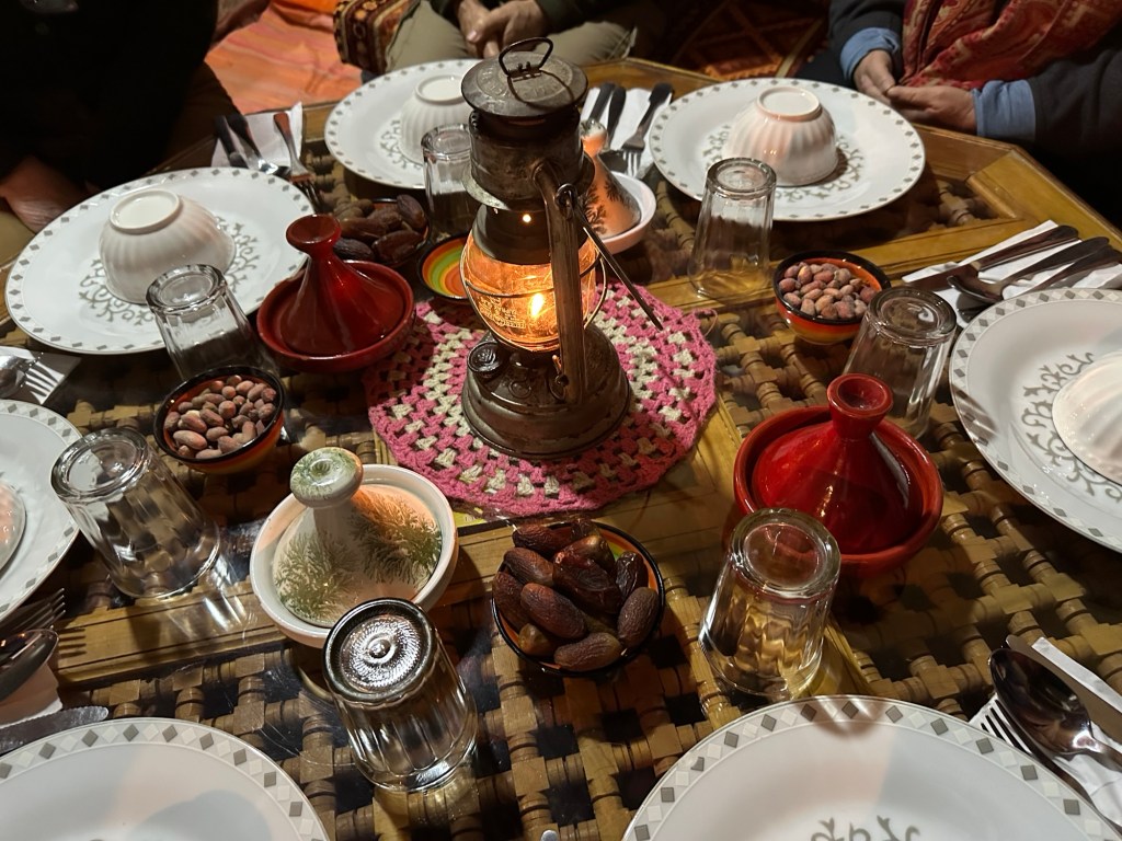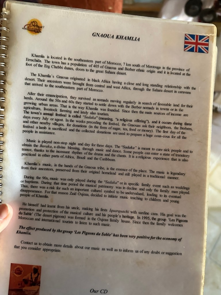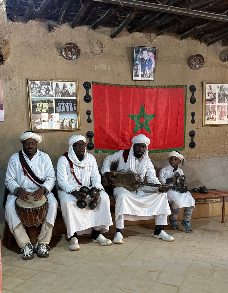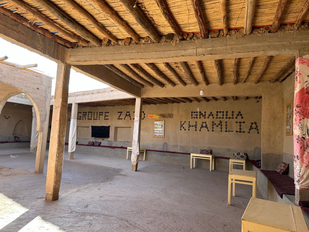 While still hugging the Algerian boarder we visit the community of Khamlia. People here come from other parts of Africa. Residents have specialized in a type of music that has origins from a few different countries; the music skills are passed down to others in the community. A large way Gnaoua musicians survive these days is sharing their music with tourists like us. We enjoy a performance and a few of us break out in dance.