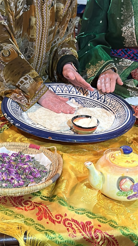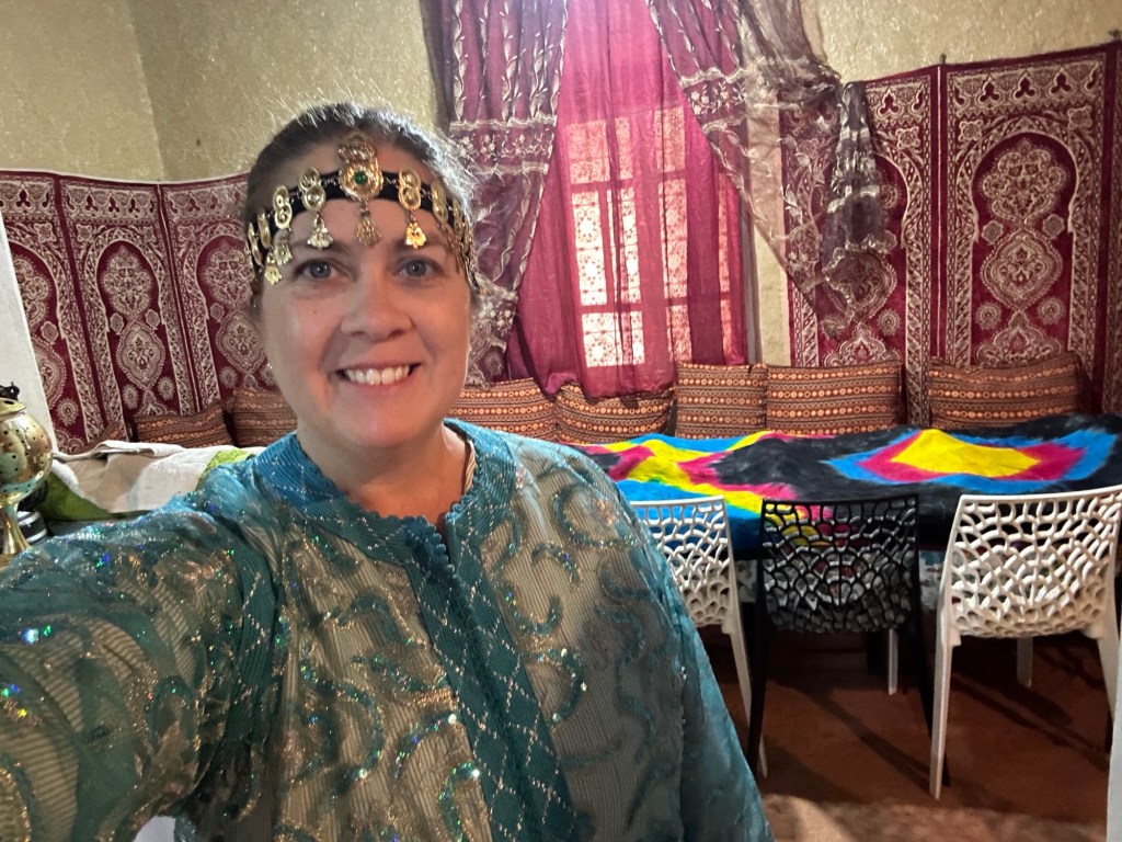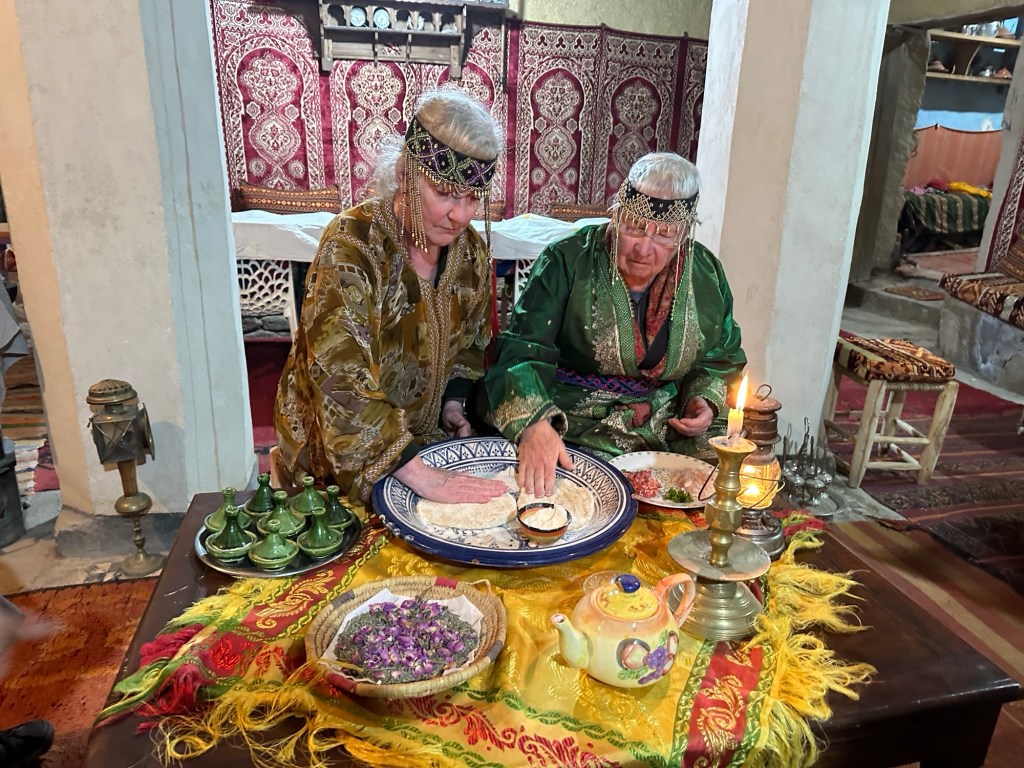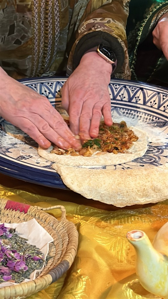 We then visit another town and where we have lunch in a home. We learn how to make medfouna and play dress up in special occasion attire to feel like we are part of the community. Berber pizza or khobza medfouna is a traditional dish.