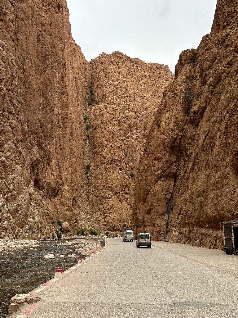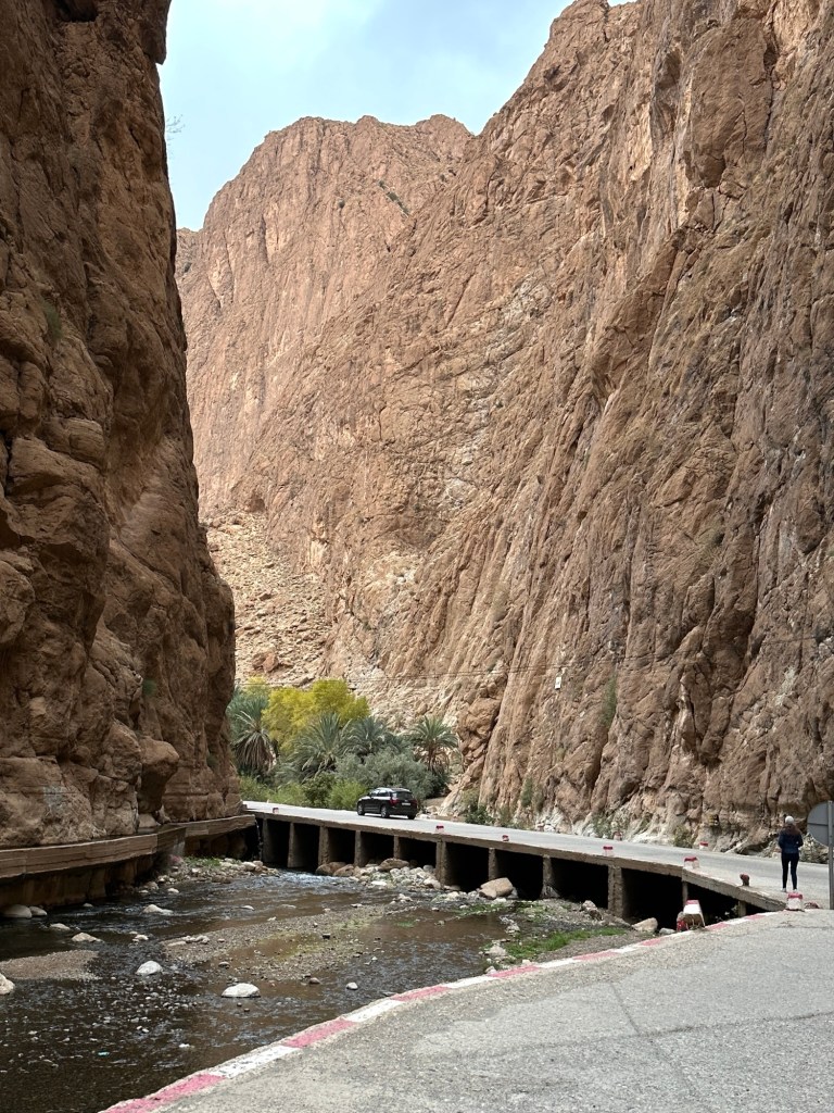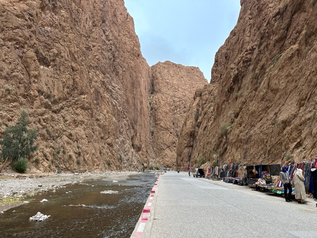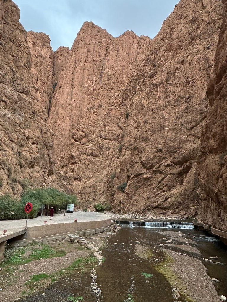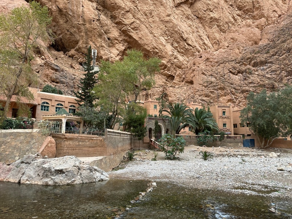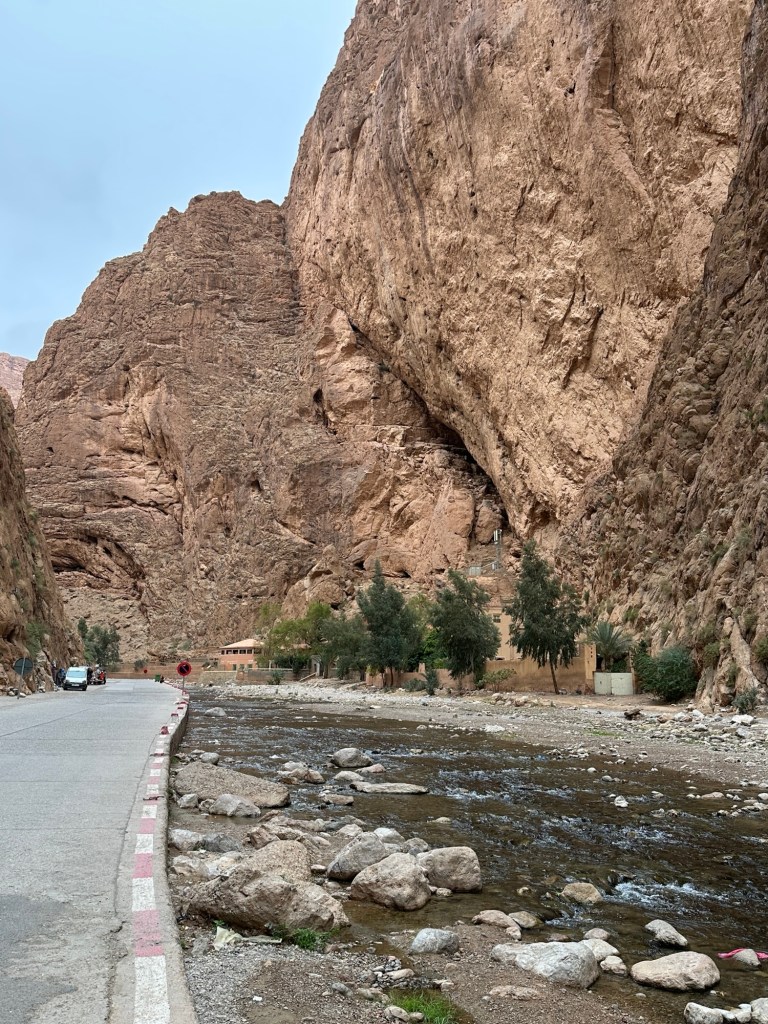 Originally we are supposed to travel to see Dades Gorge tomorrow but there is rain coming that is supposed to cause large floods in the area. Instead we schedule to see another gorge today so we don’t get trapped in the region (in fact another group after us does get trapped and we see footage of devastating flooding). For now we visit Todgha gorge instead.