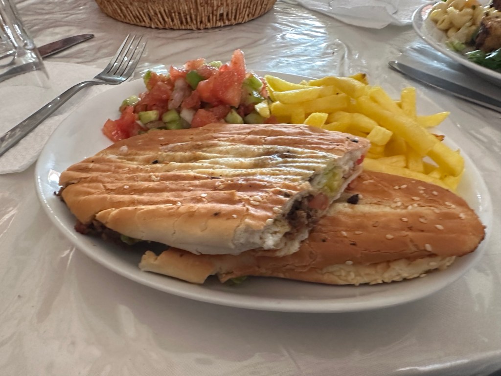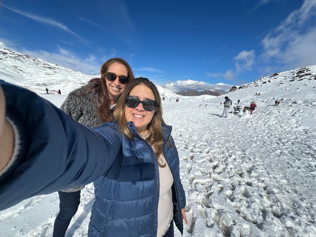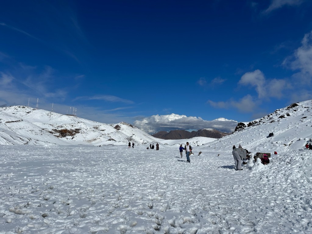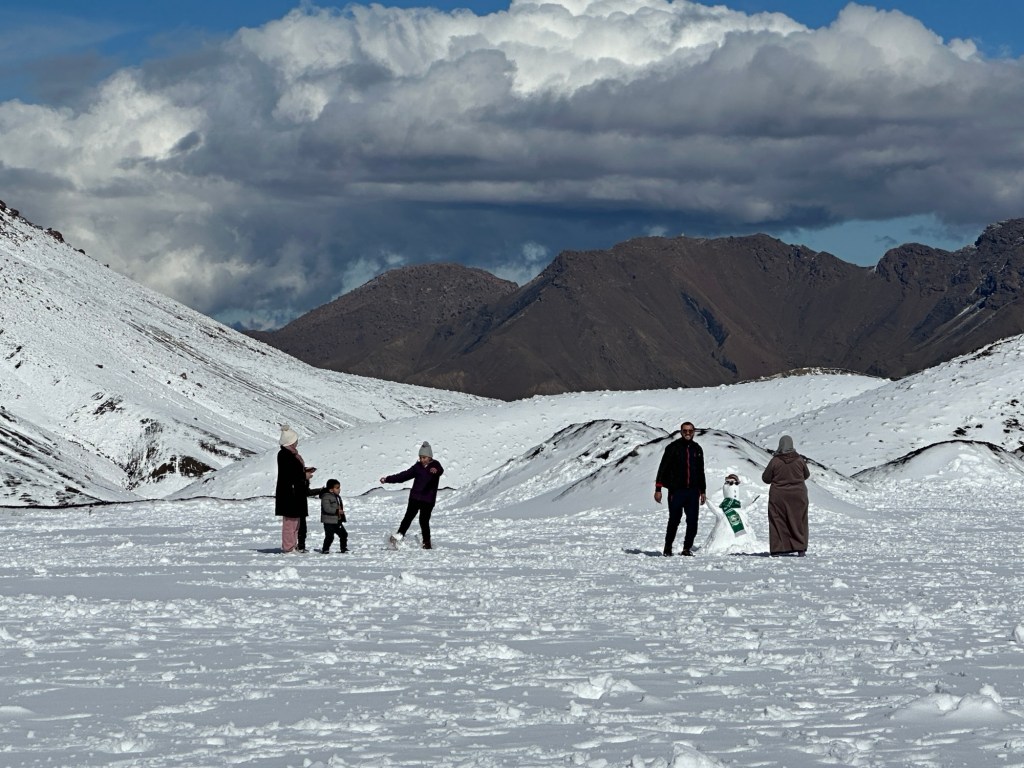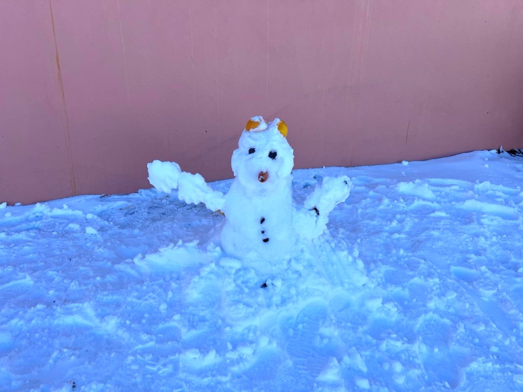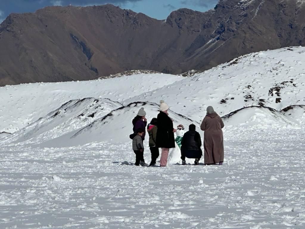 We arrive at our lunch spot to ladies and children engaged in a snowball fight. An adorable little girl whacks me with multiple snowballs while she laughs. I play along like she’s hurting me with each hit.