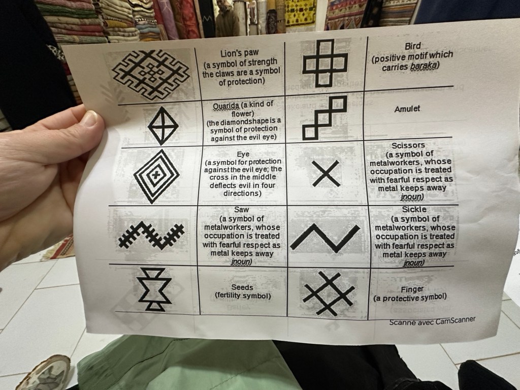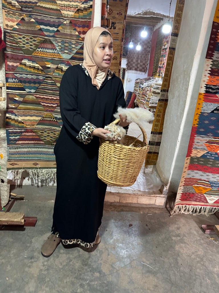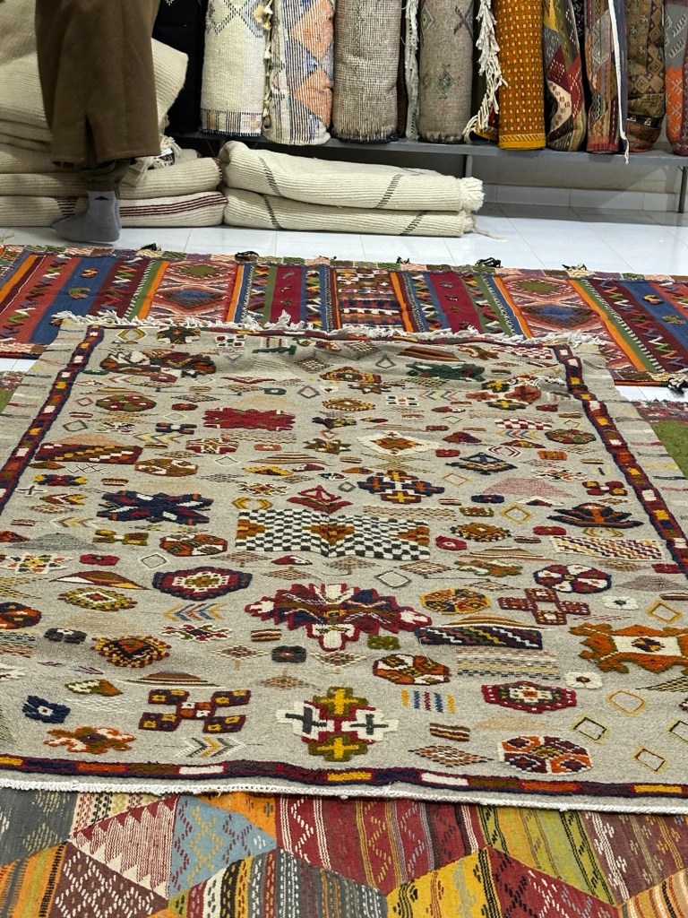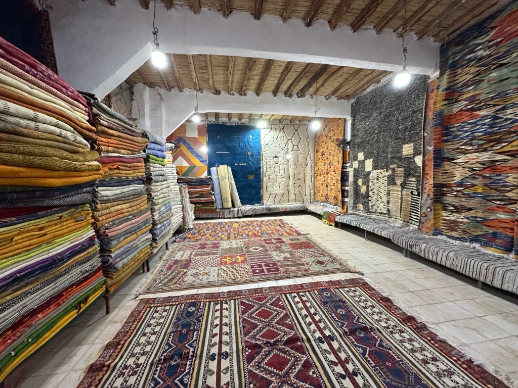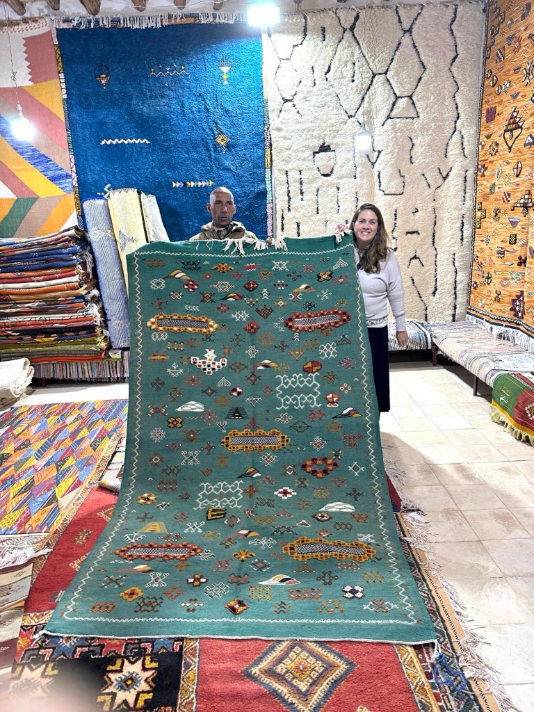 Before we leave we stop at a women’s cooperative to learn how moroccan women make and sell rugs for the area. We learn the different types of rugs that are made and the symbolic meaning of images weaved into the rugs. In the past I have so much anxiety with carpet sellers that I walk away flustered without purchasing a desired carpet from my travels, but these women make me feel right at home and I even purchase my first carpet ever while traveling. I am still deciding where to place my lovely carpet back home.