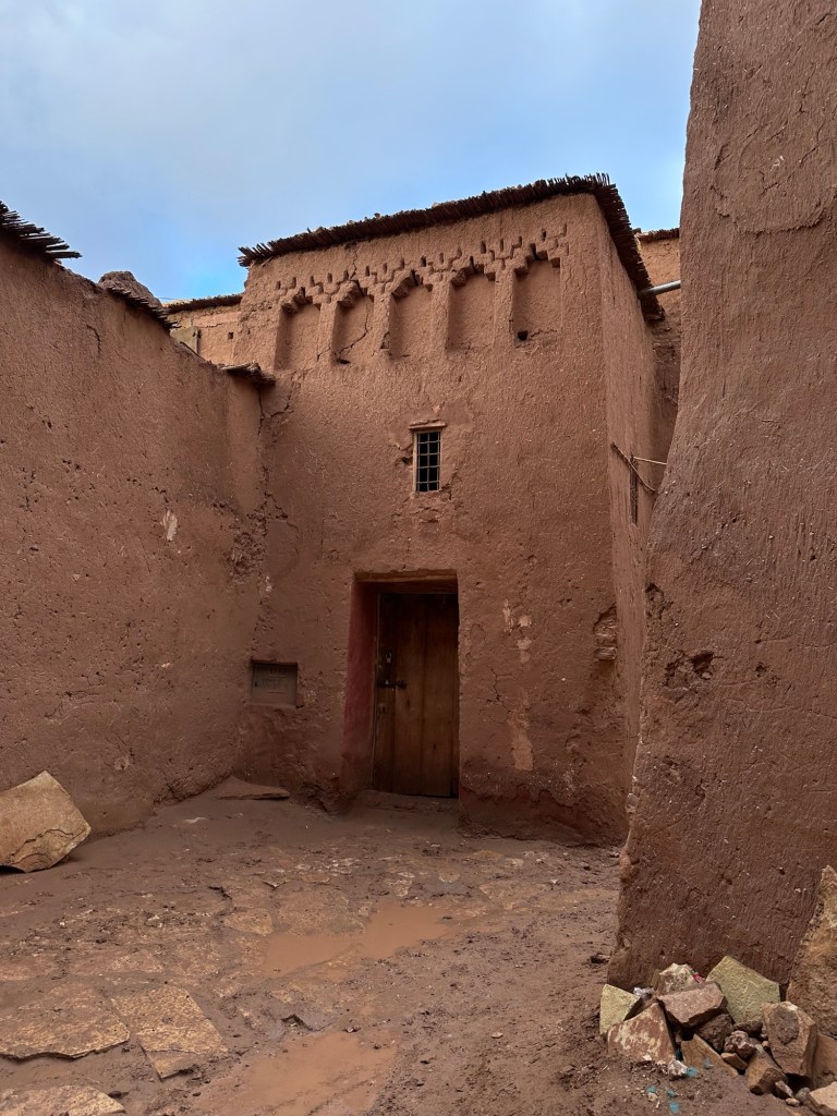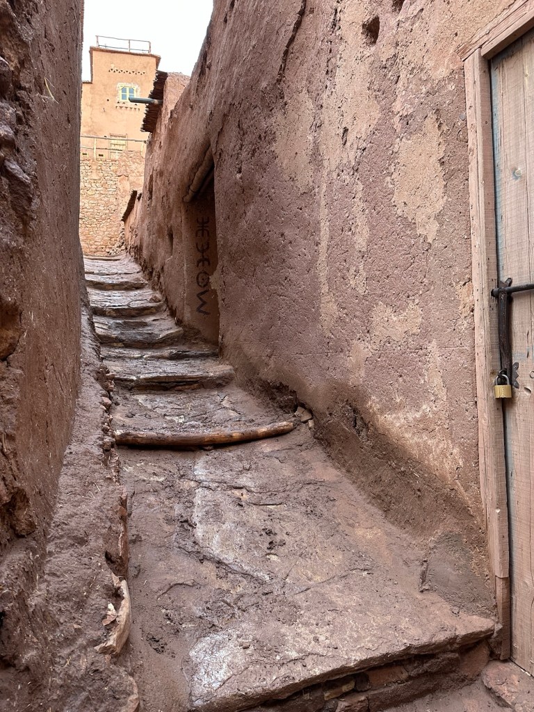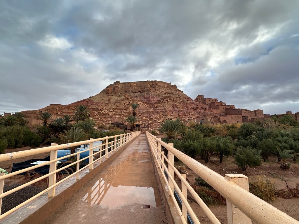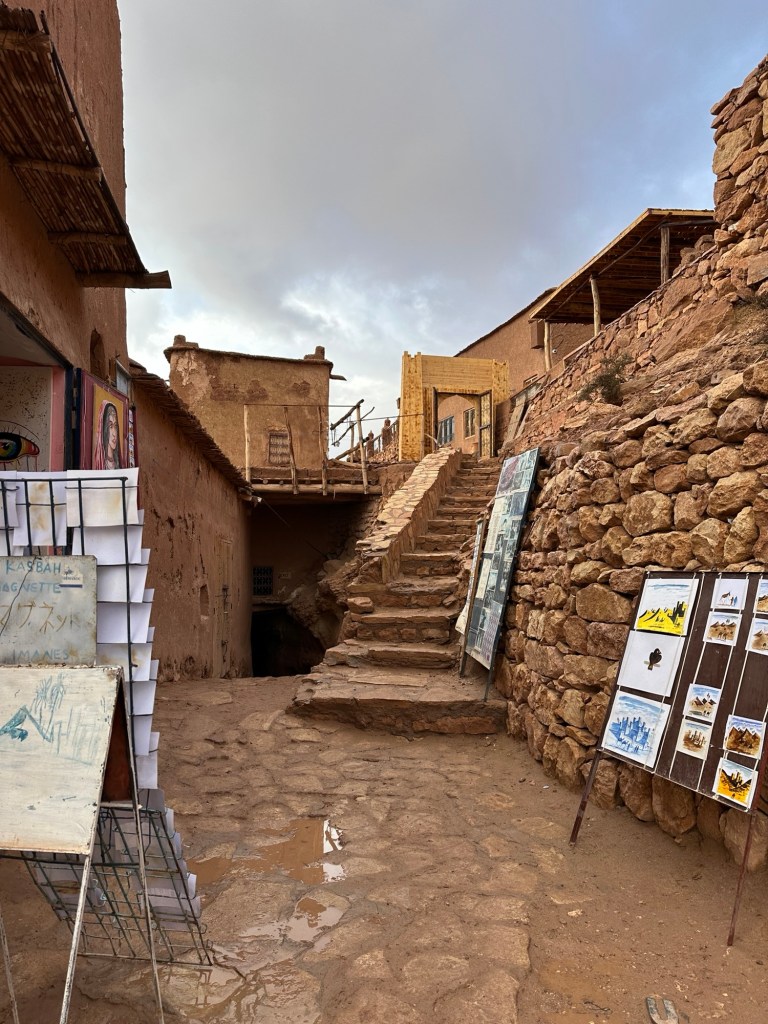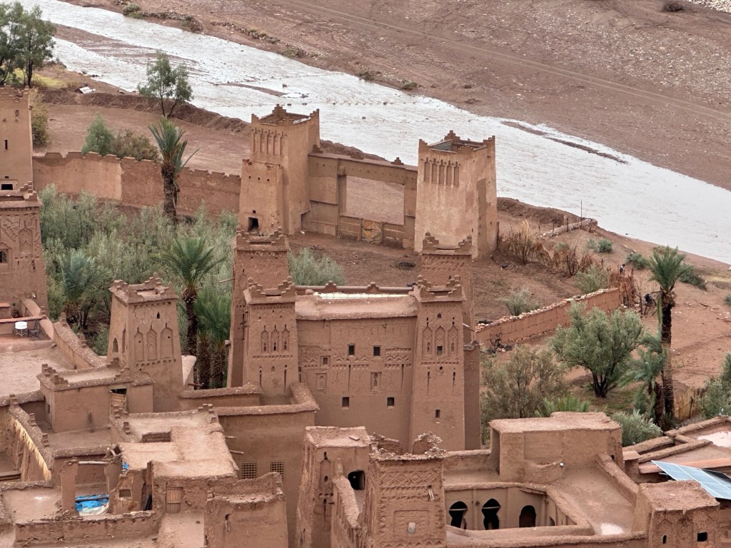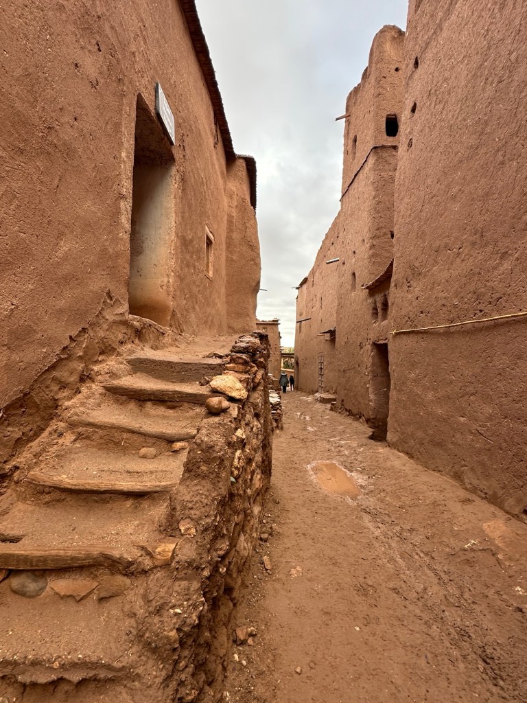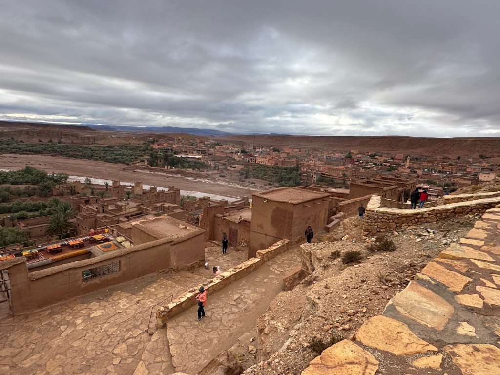 Aït Ben Haddou is a UNESCO site that is a former ksar (or village) that was a stop along the trader route for caravans. It is now primarily used for movies and tourism. It is a wet day from all the recent rain so we walk carefully to not submerge our shoes in puddles of mud in the dirt pathways of the old city as we slowly walk towards the top. It is at the top we have marvelous views of the city below. You really feel like you have stepped into the past from this view.