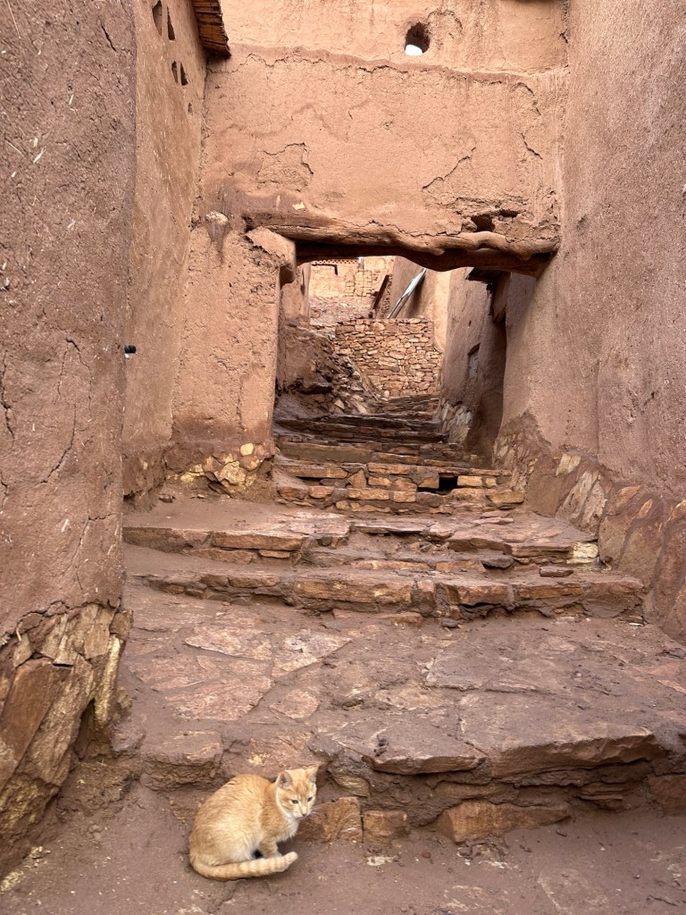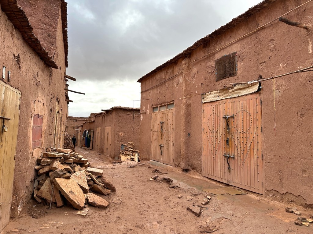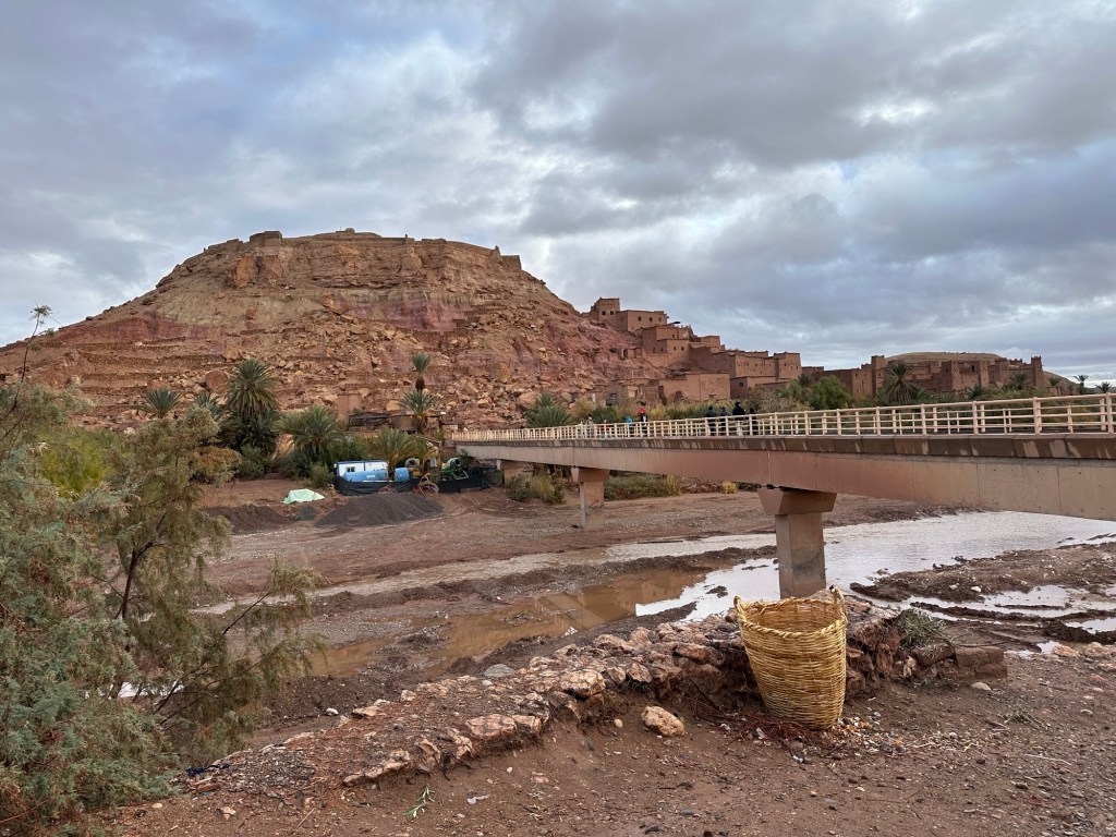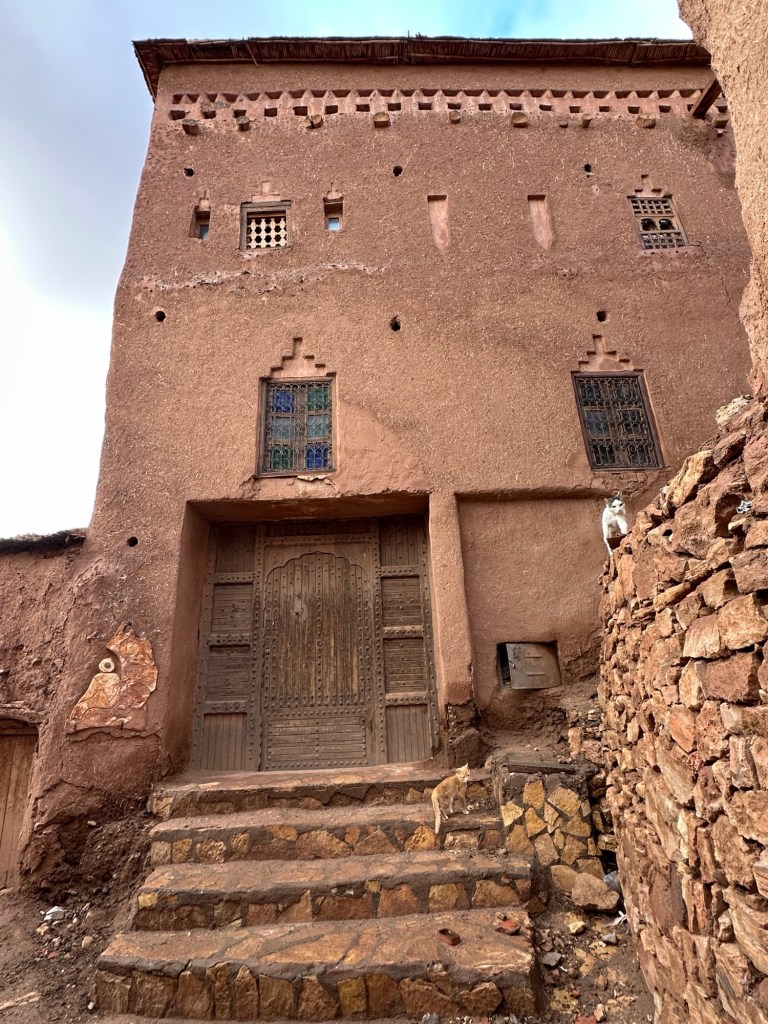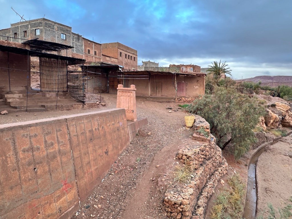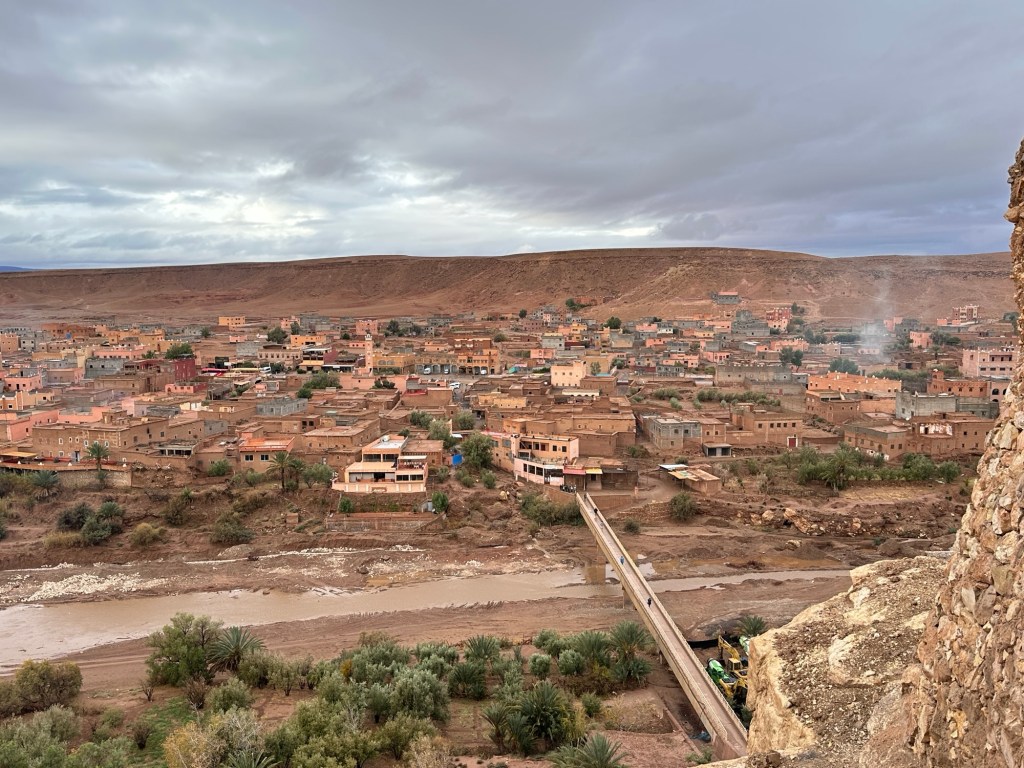 Aït Ben Haddou is a UNESCO site that is a former ksar (or village) that was a stop along the trader route for caravans. It is now primarily used for movies and tourism. It is a wet day from all the recent rain so we walk carefully to not submerge our shoes in puddles of mud in the dirt pathways of the old city as we slowly walk towards the top. It is at the top we have marvelous views of the city below. You really feel like you have stepped into the past from this view.
