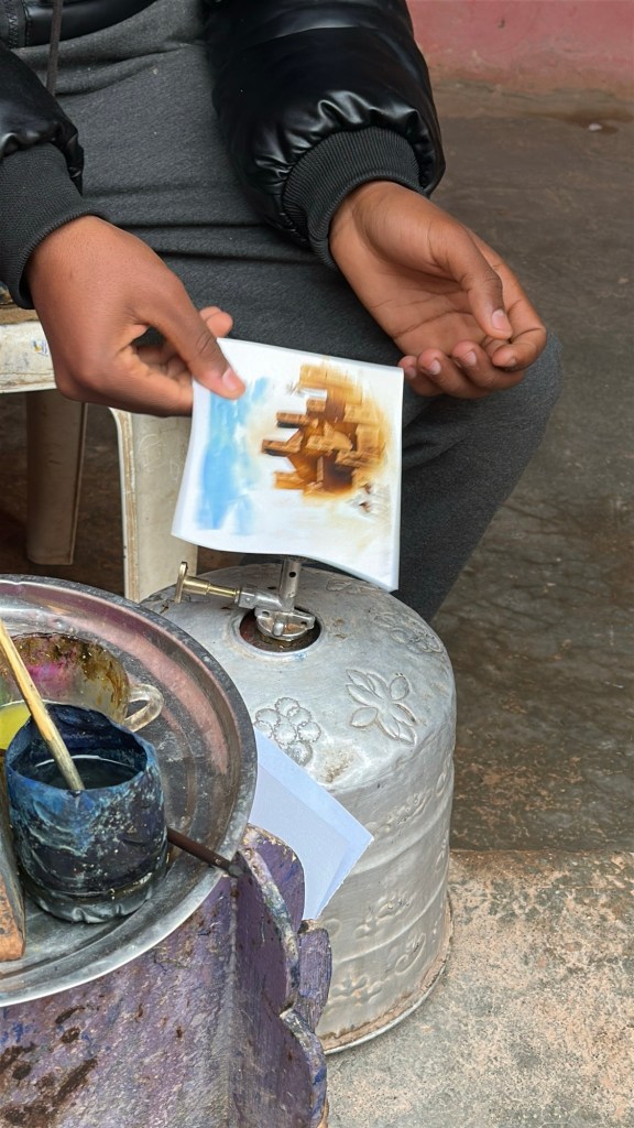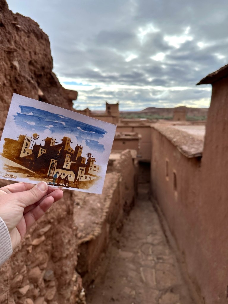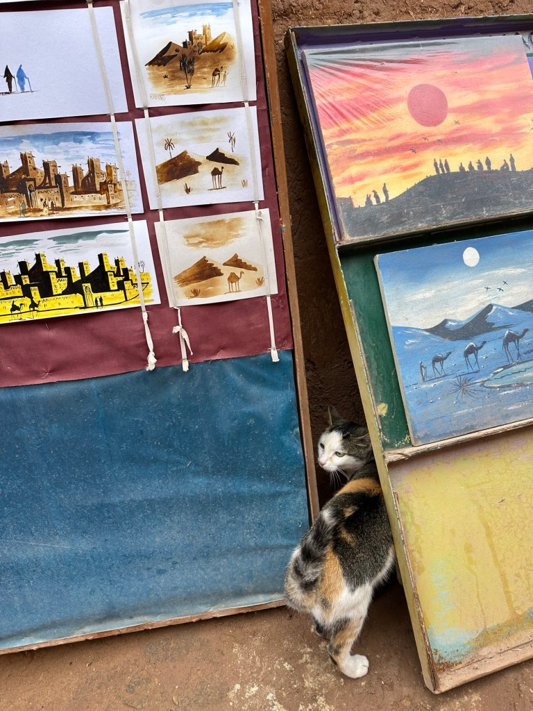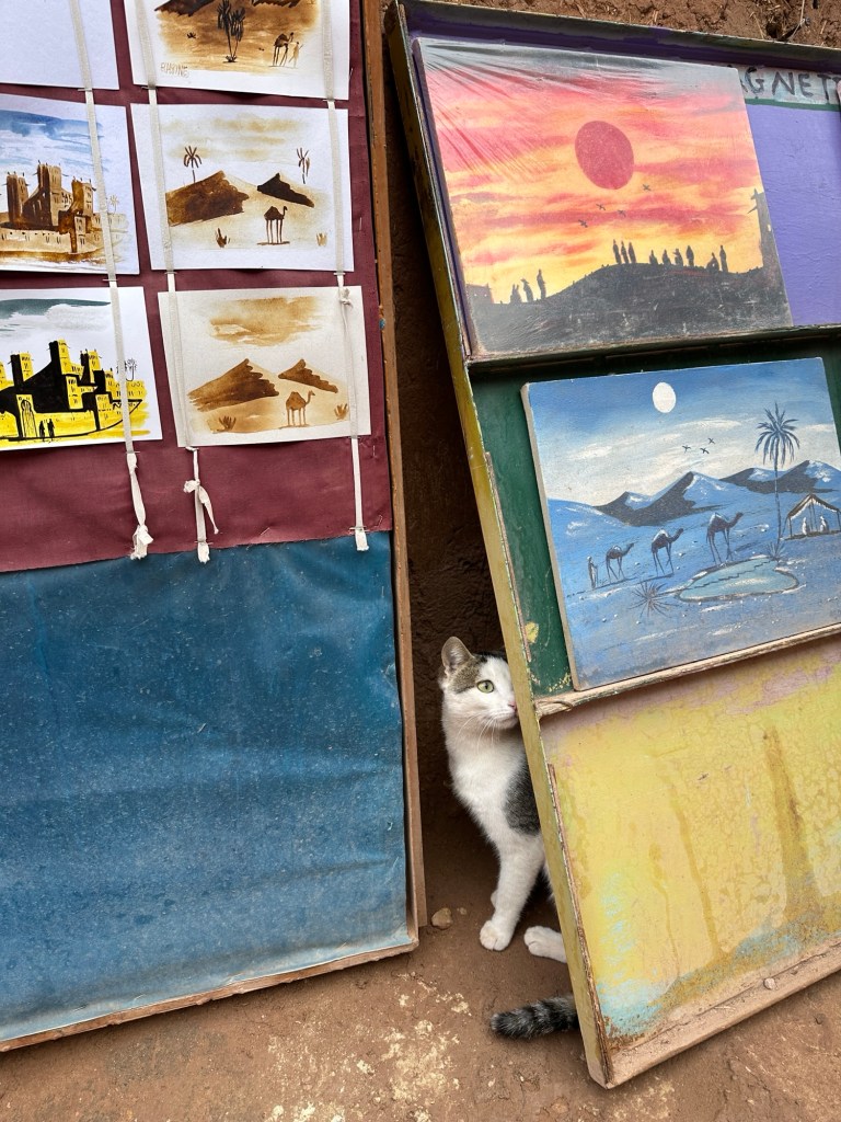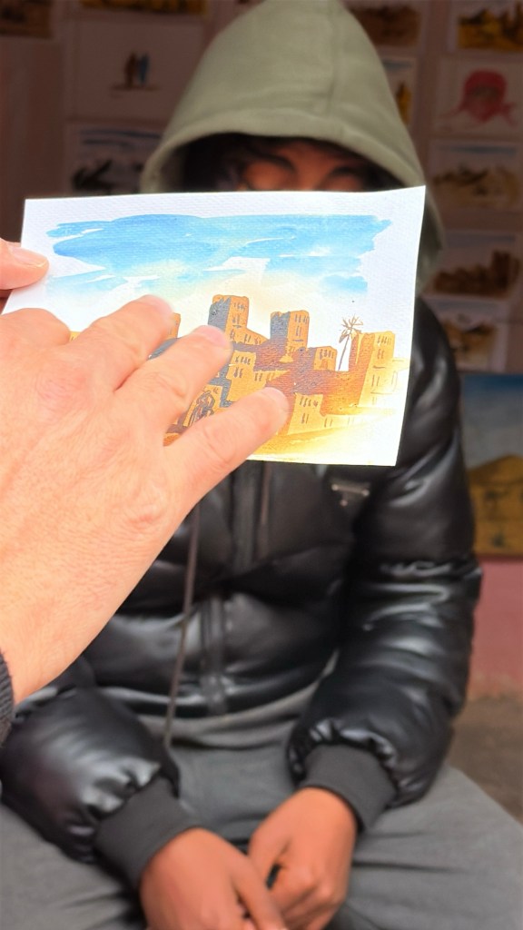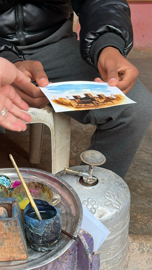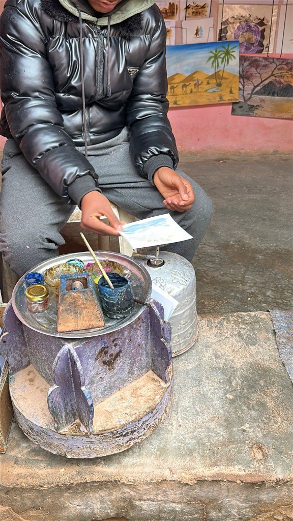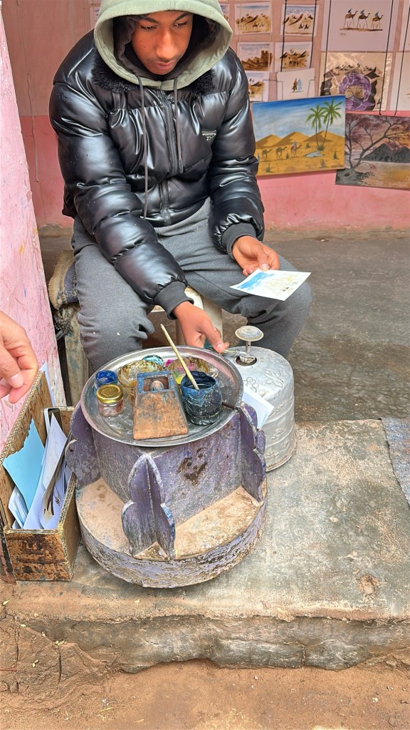While in Ait Ben Haddou we watch an artist paint in saffron, indigo stone, tea, and sugar. The art is invisible until it is put over a fire. A secret message or painting will be activated by heat. This method was used during times of conflict to pass secret messages. I purchase one of these paintings as a keepsake of the day.