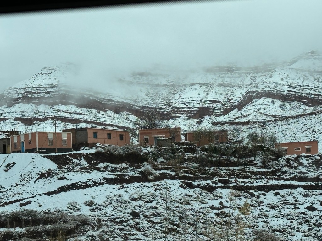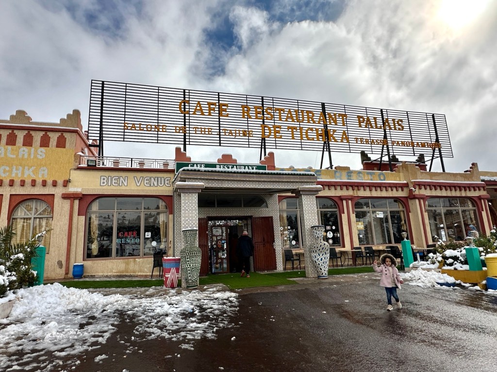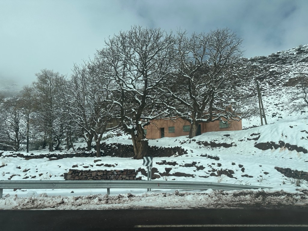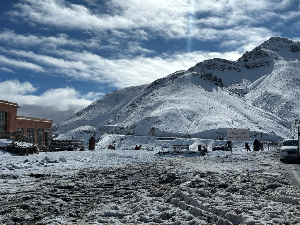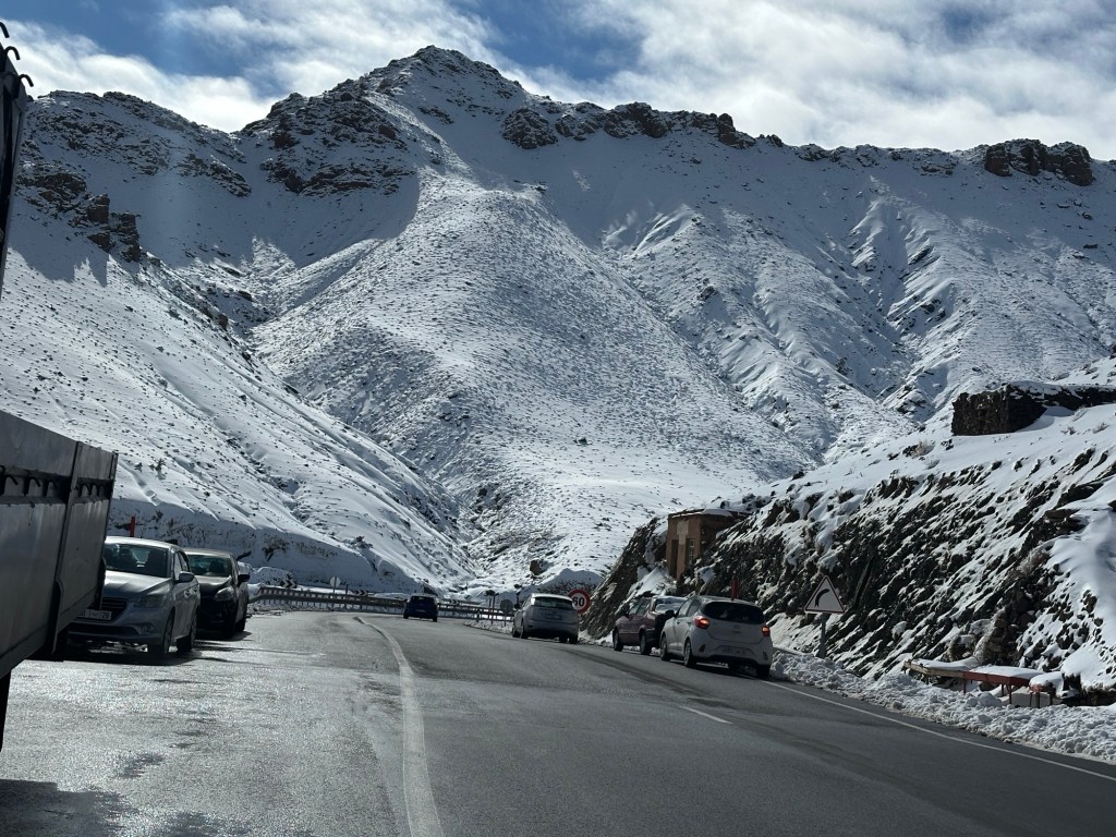 After a stop for pictures in the snow we start our descent out of the mountains. We watch excited kids sliding down snow hills in the process. We eventually arrive in Marrakech and spend our first evening in town on our own. More on that later.