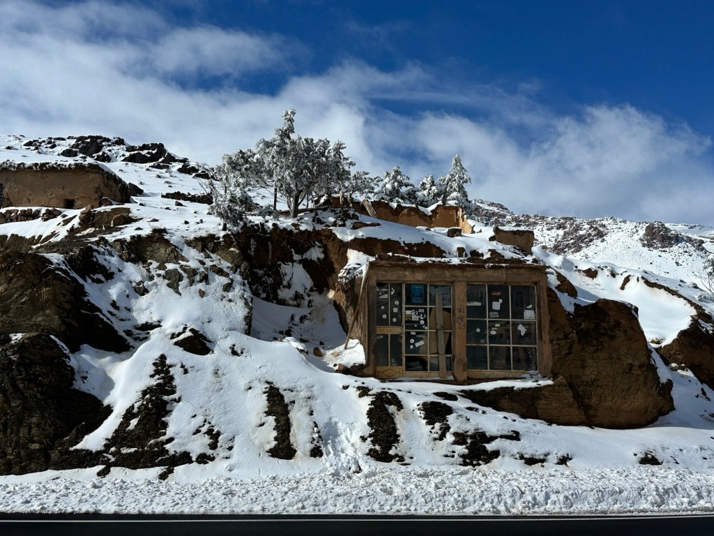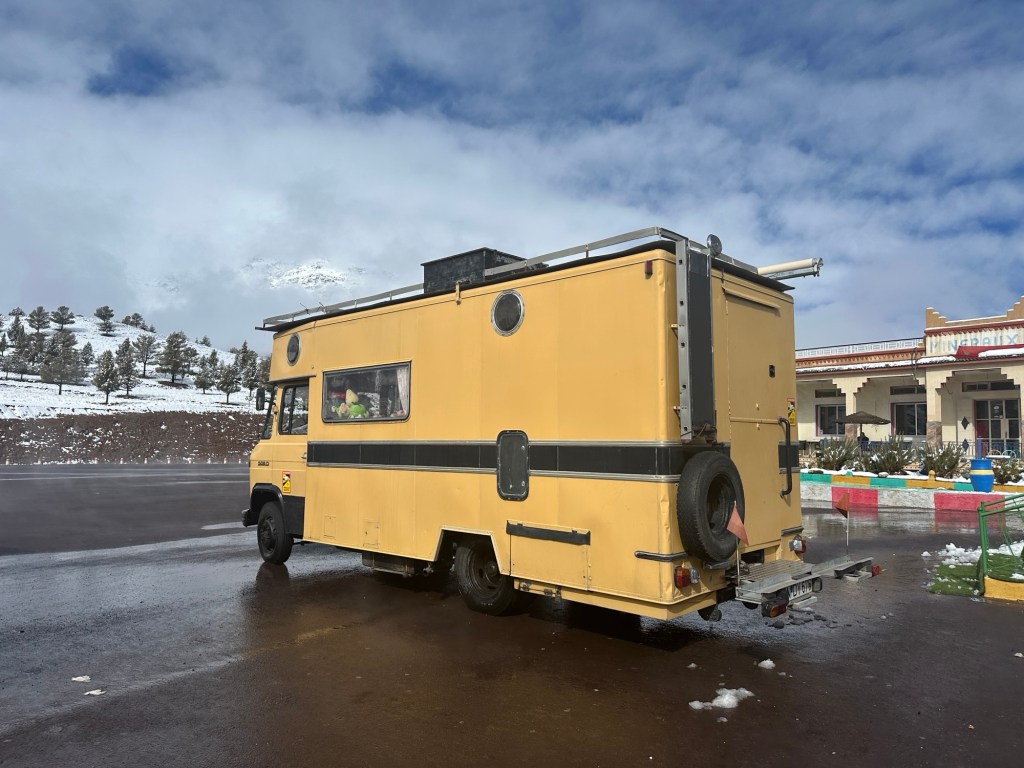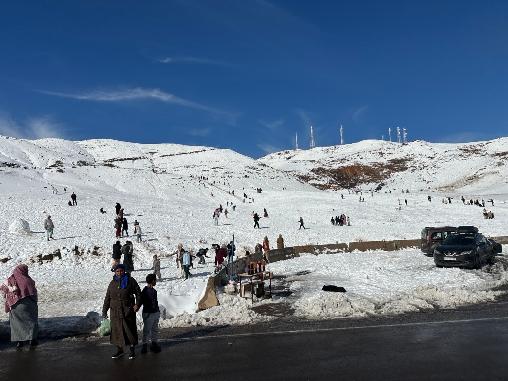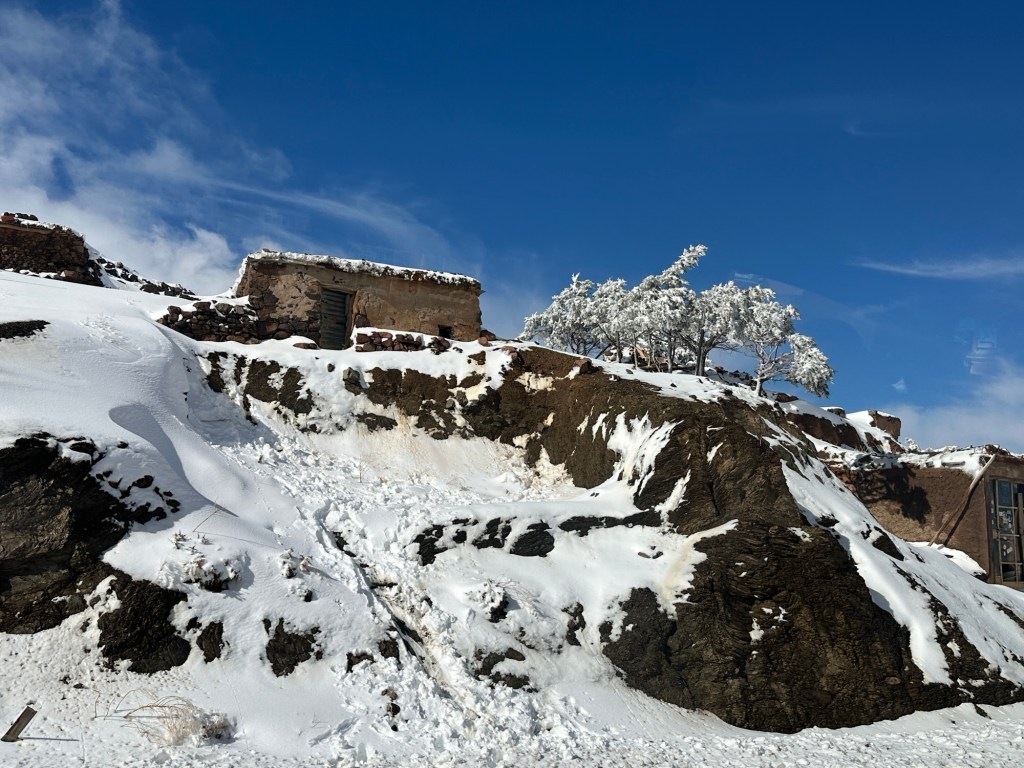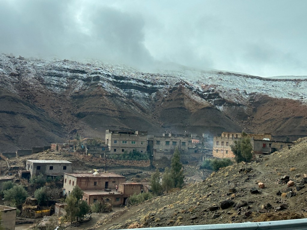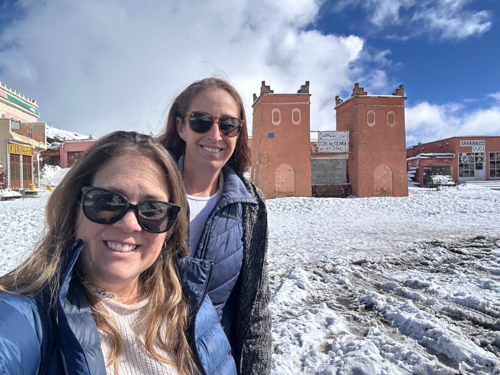 After a stop for pictures in the snow we start our descent out of the mountains. We watch excited kids sliding down snow hills in the process. We eventually arrive in Marrakech and spend our first evening in town on our own. More on that later.