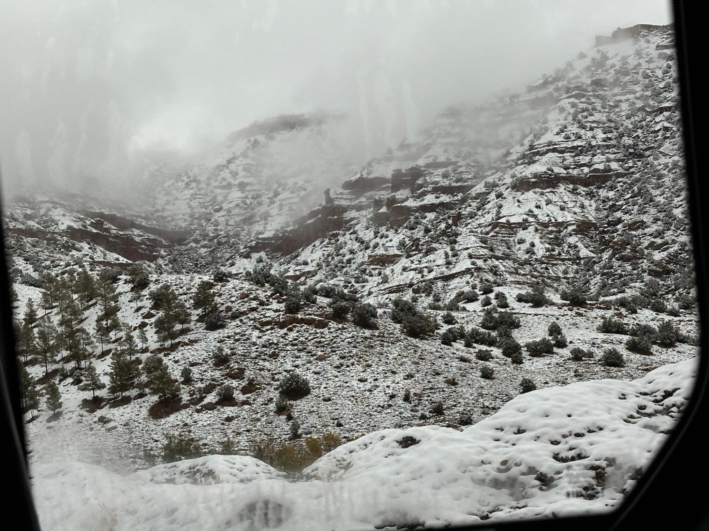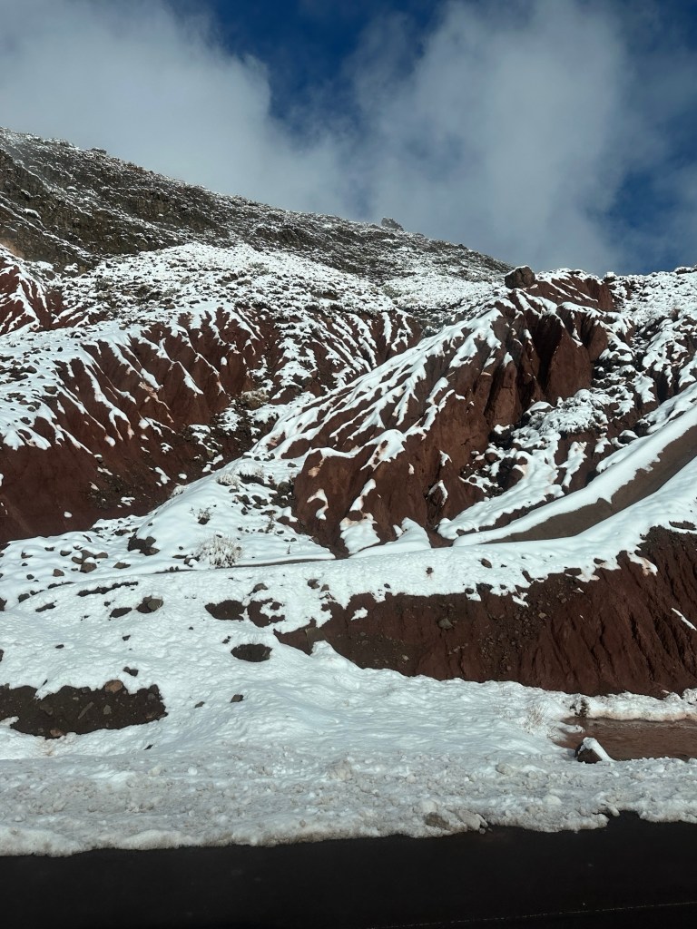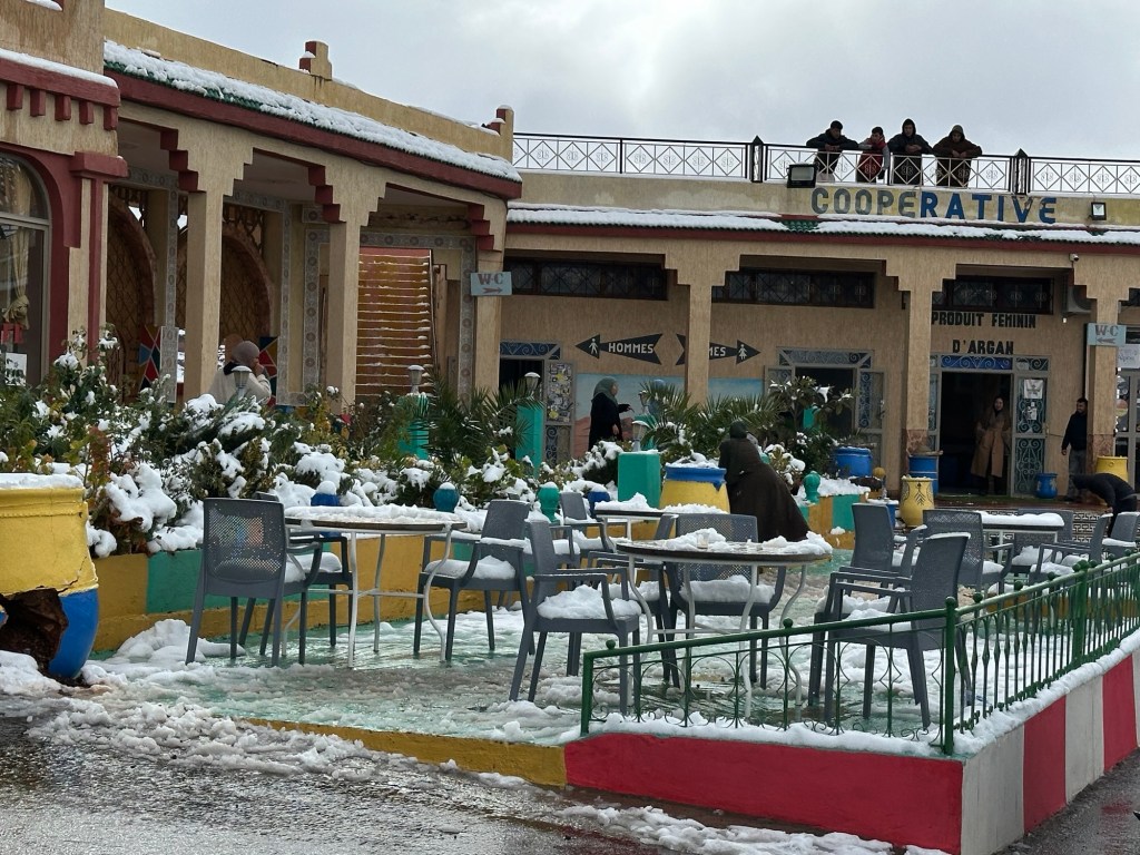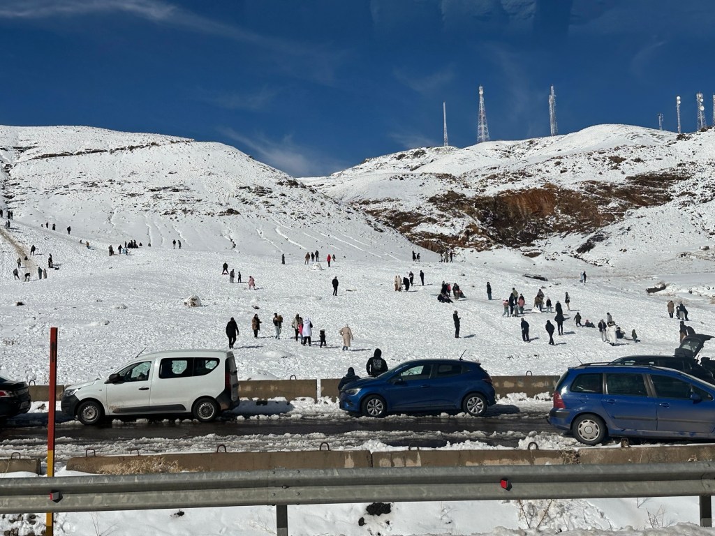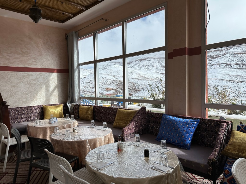 After a stop for pictures in the snow we start our descent out of the mountains. We watch excited kids sliding down snow hills in the process. We eventually arrive in Marrakech and spend our first evening in town on our own. More on that later.