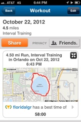 Some may have heard me complain on how inaccurate Map My Run has been at tracking my mileage and pace. At first it was real cute – especially when it would tell me my first mile was completed in 6 minutes (at best I can run a mile at 11:30 – and that is my 5K pace). I soon learned that my mileage did not add up correctly. I struggled through races thinking I was further than I was until I would see a mile marker that would slap me in the face again; My running group always had their GPS at another mile marker when I checked. I could have kept lying to myself but I really do want to improve my half-marathon pace and not just screw around. I really want this thing to work correctly. After using it for 10 months consistently I have finally discovered why it might not be working for me. I am too damn slow for it. The application cannot handle what I consider running (which is a combination of slow running and 1 minute walking intervals). Today I switched the setting to “interval” training and voila. My last training seemed much closer to the true pace and mileage. Hopefully this problem is resolved because I am in the home stretch to my next big race.