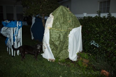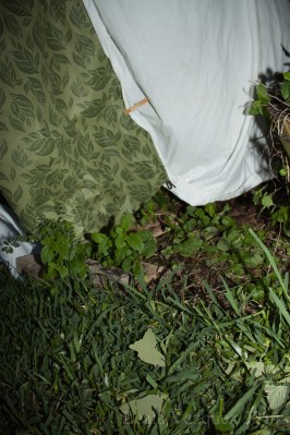 My plan to use the EZ-UP to make a tomato tent was a failure (see the closed tent to the right). I rushed home from work to put the tomato house together but I could not put the tent up on my own. After trying for about 30 minutes I gave up on that plan and went back to what I know – sheets. I had a couple of coverups that were given to me as a gift last year. Two of them were used but the third completely fell apart (see photo below). What the &*&(*&???