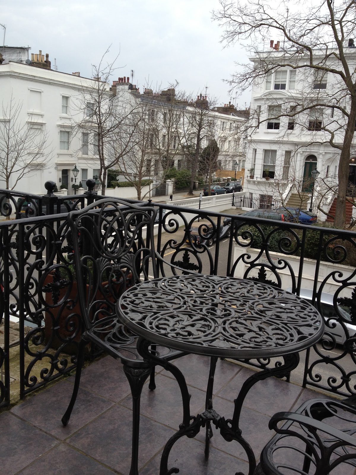 London proved challenging to find decent budget accommodations.  The prices are up there with New York prices (or higher). We settled on paying a bit more for a room in an Victoria Townhouse near Kensington Gardens. We weren’t too far from the tube and in walking distance to Notting Hill and many attractions. Our room had this lovely terrace.