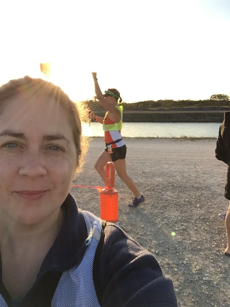 And it gets dark and it is time for my run. I don’t have any pics from the run since it is very dark. My head lamp is essential. The course is mostly flat so the only reason why it might be considered very hard is because it is very dark, there are scary noises in the bushes, and you could be by yourself for much of the run. I was by myself for at least a mile and a half before someone passed me. It was kind of creepy and dark. I started off at a good long run pace but then I slowed considerably. I was tired and finding it hard to be motivated to push through this run.