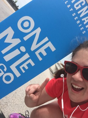I finally get to the one mile sign and want to take my only selfie opportunity for the run. I can’t get it right. It takes me many tries and many seconds. I give up and keep running.
