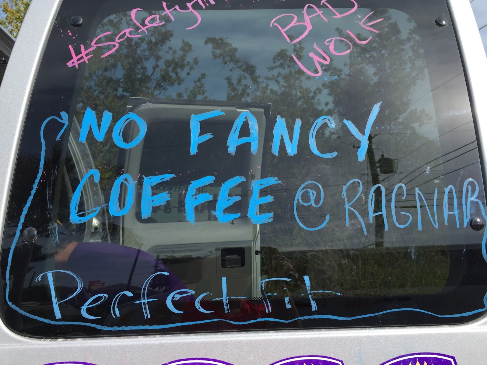 Somewhere in this stretch we attempted to get coffee and pee at a Dunkin Donuts. They were overwhelmed. I waited in a 30 minute line for the bathroom and others waited for 45 minutes for coffee. It prompted the decree below. “No fancy coffee” at Ragnar. Get your standard coffee and go! Your fancy skinny mocha latte is holding everyone up!