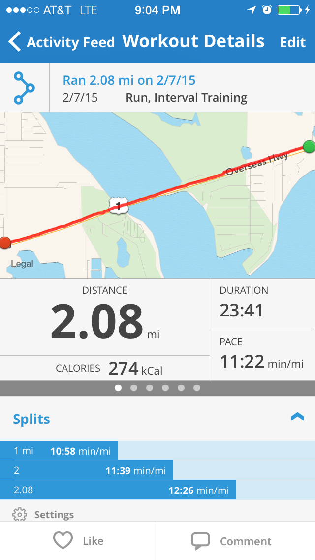Soon it was time for my run. It was an less than exciting run through Miami. The most interesting part about it was running on the wrong side of the road because I decided to follow a runner ahead of me instead of following my instincts (and the signs). Luckily I got a call from Carlos to tell me to cross the street. My pace was much better than I expected, even considering that I lost over a minute waiting for a cross walk signal that never came. Miami stinks. It was this first run that I discovered that my speed work had paid off. I finished ahead of schedule.