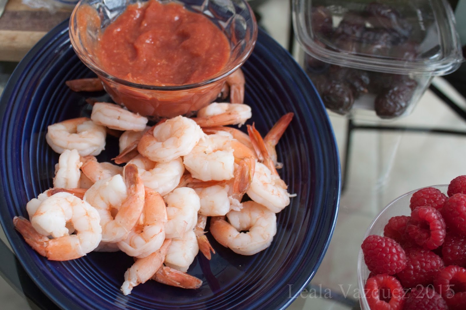 Shrimp and berries to hold us over until food is ready