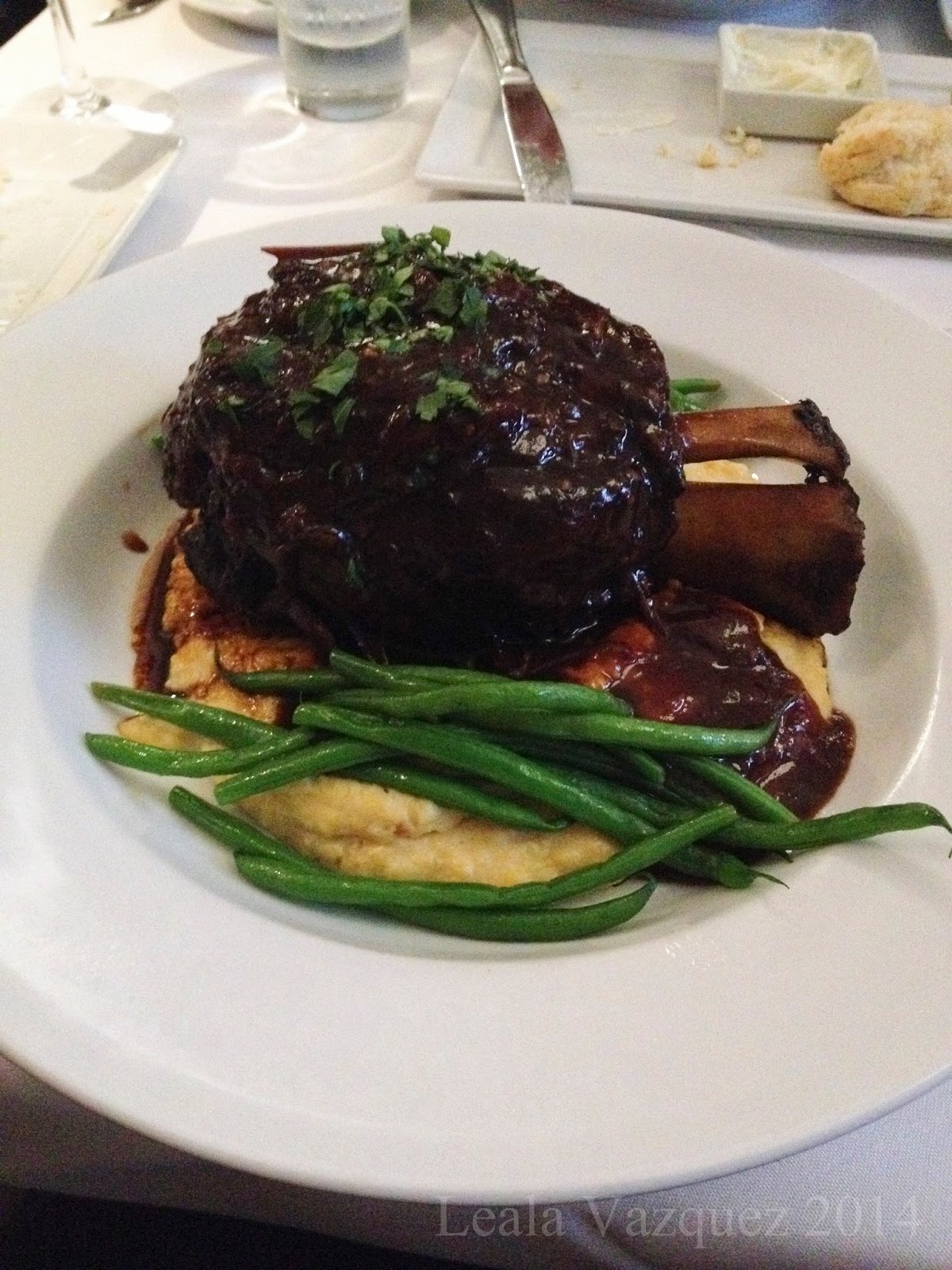 I decided on the pork shank for dinner. It was one of the best meals I have ever had. The pork easily fell off the bone and was cooked perfectly. The sauce complemented it very well. The garlic goat cheese grits provided a tasty bed for the shank to rest upon.