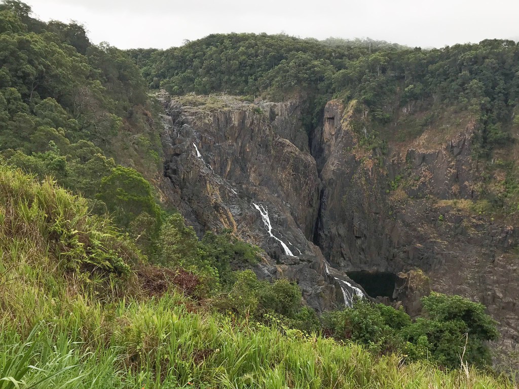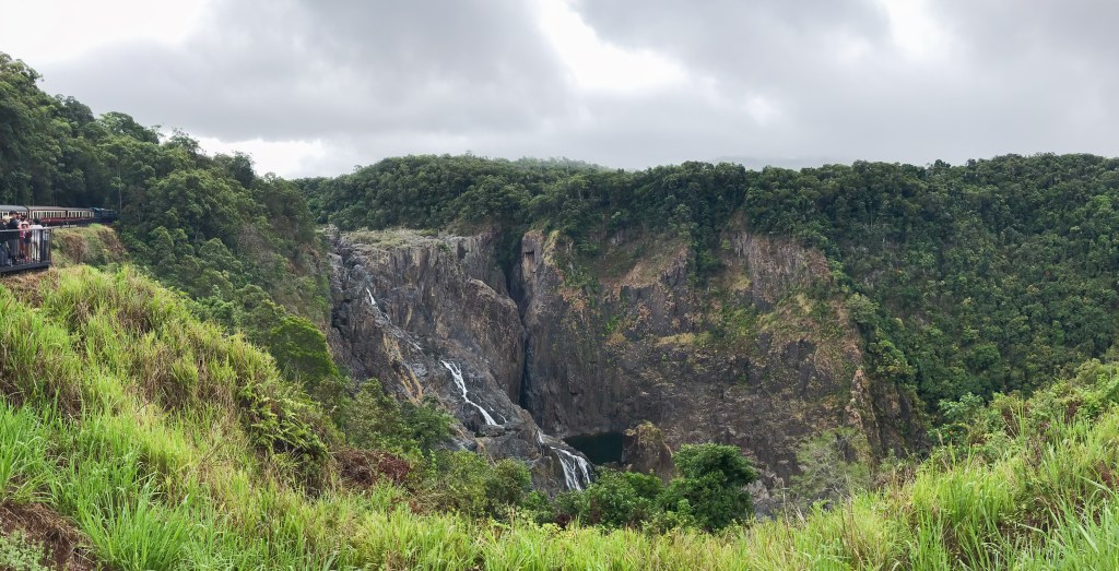 We make our stop at Barron Falls where we view the falls off into the distance and stretch our legs. It starts raining during this stop so we run back in to our seats after some quick photos.