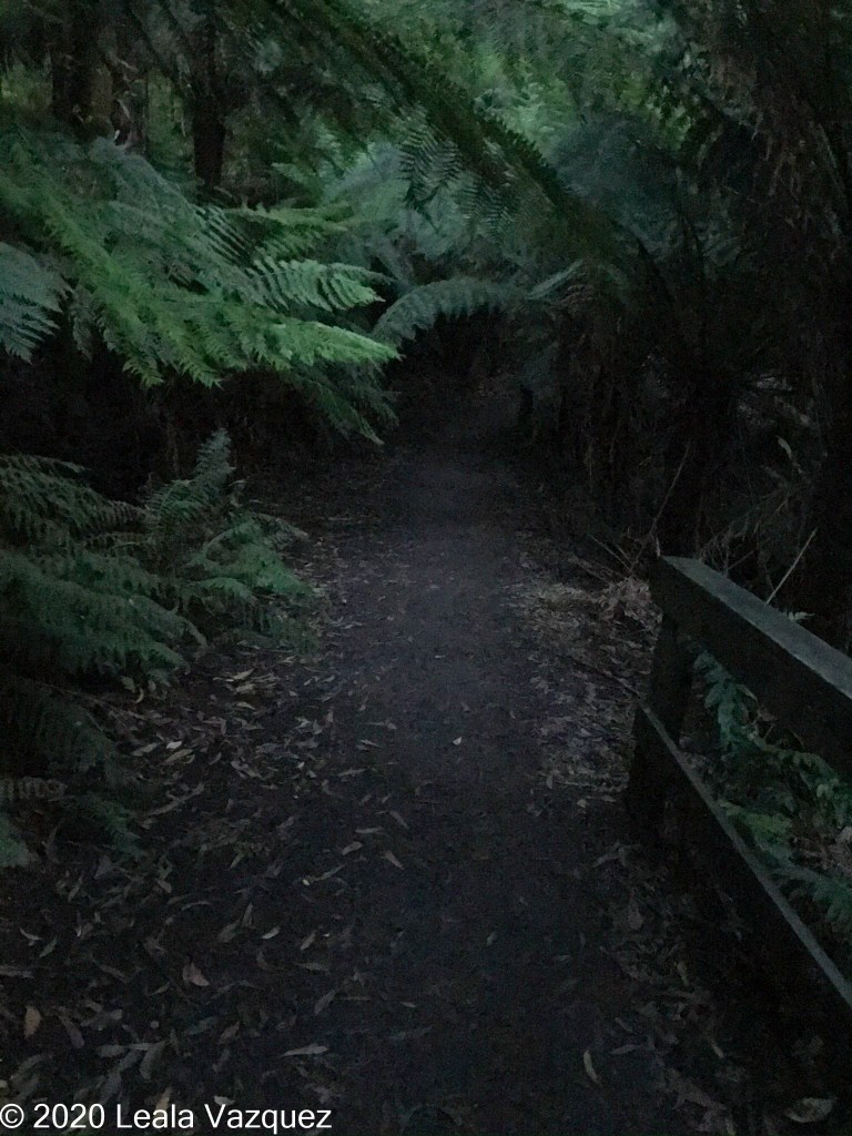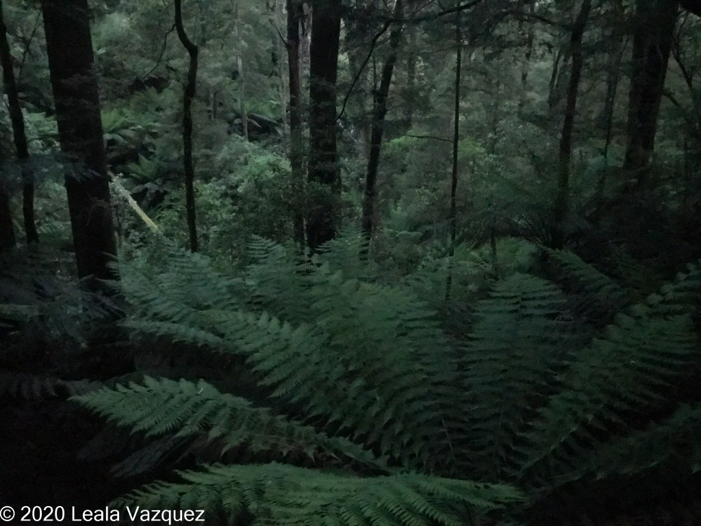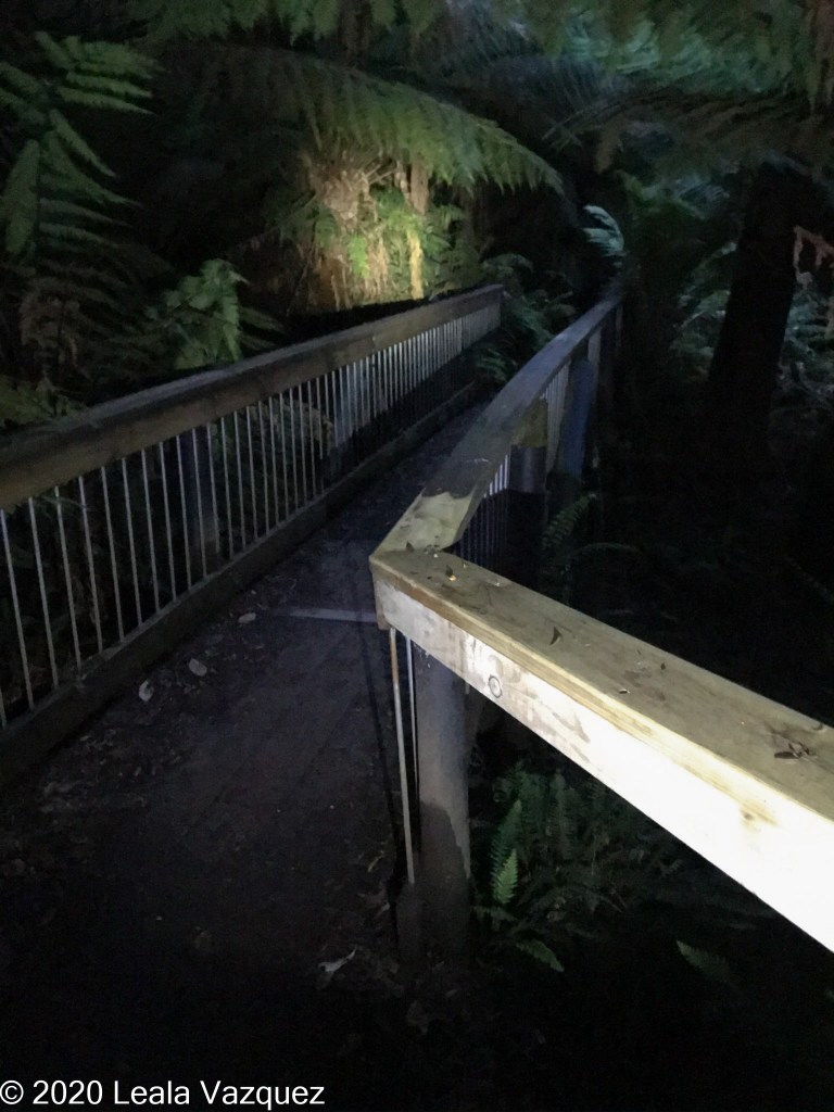 I am walking on a path through a rainforest. It is damp and I see a stream of water and listen to its meditative flow. Darkness unfolds. It is almost pitch back except for a slight bit of sunsetting light. I can’t see what is around me but I hear water flowing below and the sound of something moving around in the dark maybe; or maybe I just the hear water hitting rocks, or maybe it is an animal. Almost an hour has passed and I am still out here alone. This seems to be turning out to be another one of those “this isn’t the best idea and I could get murdered” situations; I have had a few of these traveling solo but have been lucky thus far. I walk back and forth along the boardwalk and start spotting a glow worm or two as it finally darkens. They are hard to see but I start picking them out.
