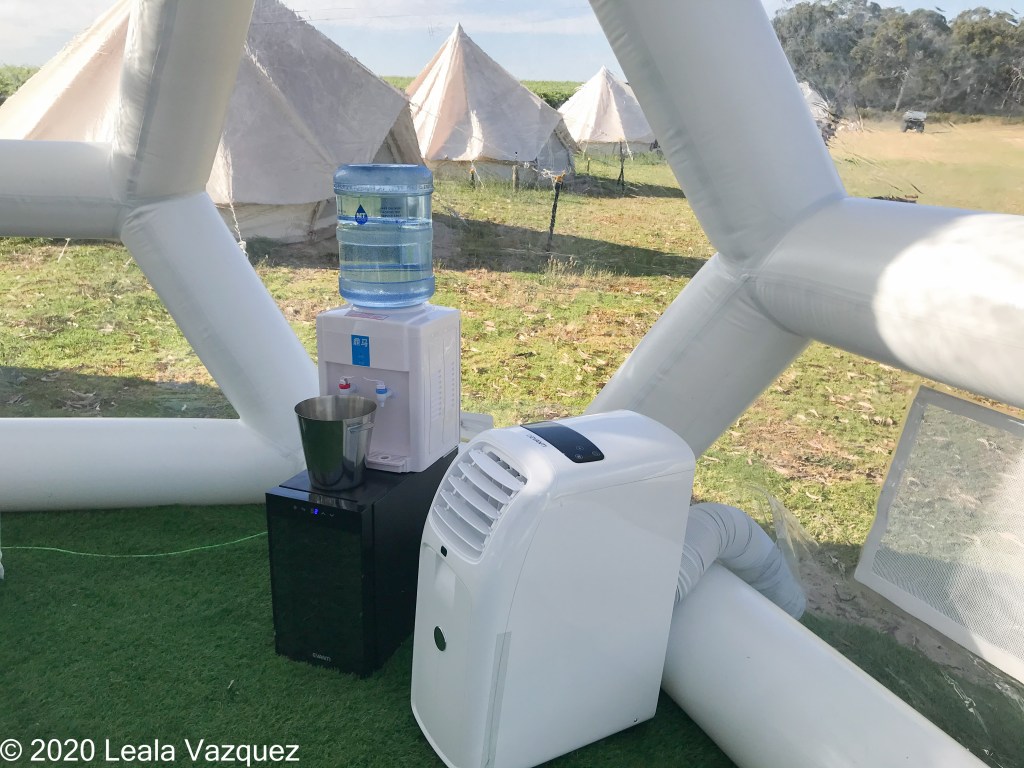 My tent is now ready and the air conditioner works on cooling the tent. In time I find it is way too hot to lounge inside the tent with the sun during the day; there is an air condition unit and wine chiller but they are no match for the heat. The bubble tents are really more appropriate during cooler months, not in the middle of an Australian heat wave.