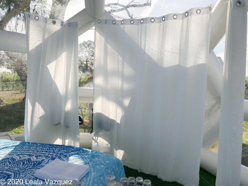 There are vineyards next to me and I have a nice view of the sunset. The top of the bubble gives me an semi-obstructed view of the stars and moon.
