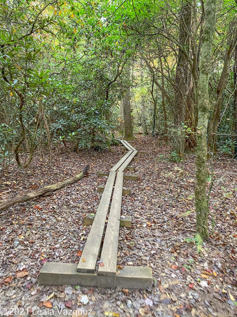 I finally get to an area of flat paths at the last part of the trail. Wooden planks are elevated side by side to make a wooded trail. I assume this area must get wet at times. My legs are about to give up but I am just happy it is cool and flat here. I think I am getting close to the end.