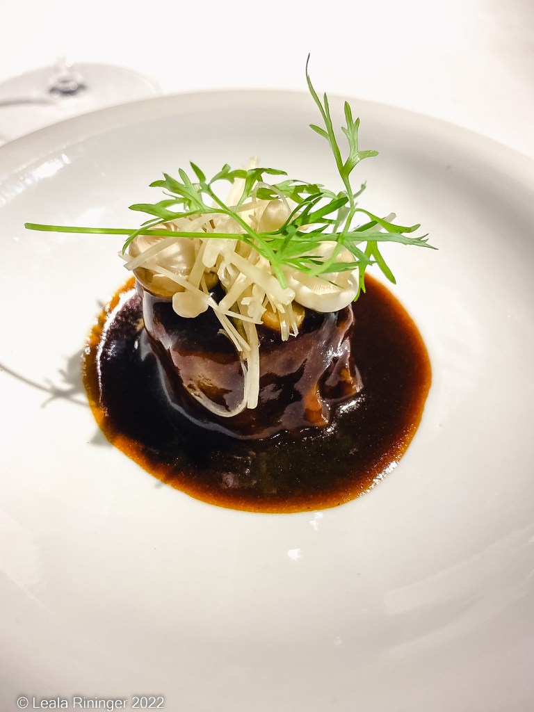 I am instructed how to eat each each item. I don’t pay attention enough to the instructions so when I try to bite down on the mushroom bun the insides explode all over the place. I’ve made a mess and it is only the first course. I like this course very much and enjoy the different ways the mushrooms are prepared.