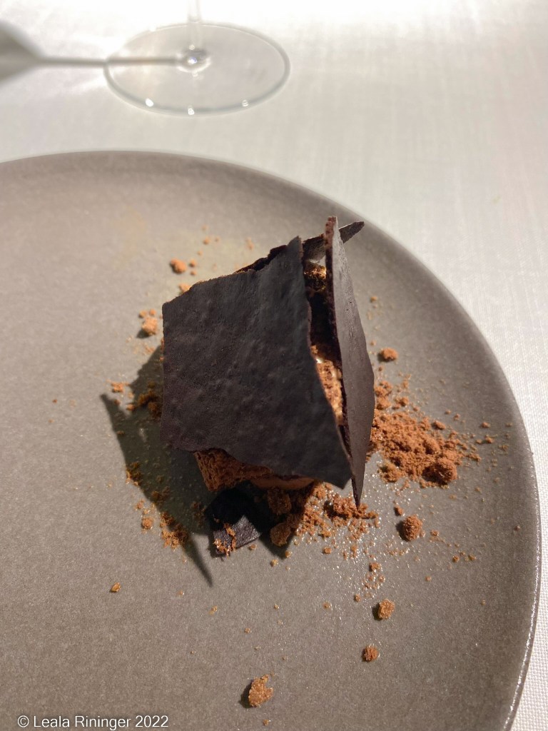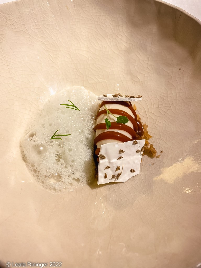 Finally we reach the dessert courses and the first item is a celeriac cake with fennel. I am not a fan of fennel but I don’t mind this dish. Celeriac is a turnip like root vegetable sort of related to celery. I am not sure I’ve ever noticed it in supermarkets in the USA. The cake has a nutty flavor and the fennel compliments it. Also it isn’t too sweet. I don’t care for desserts that are overpowered with sweetness.