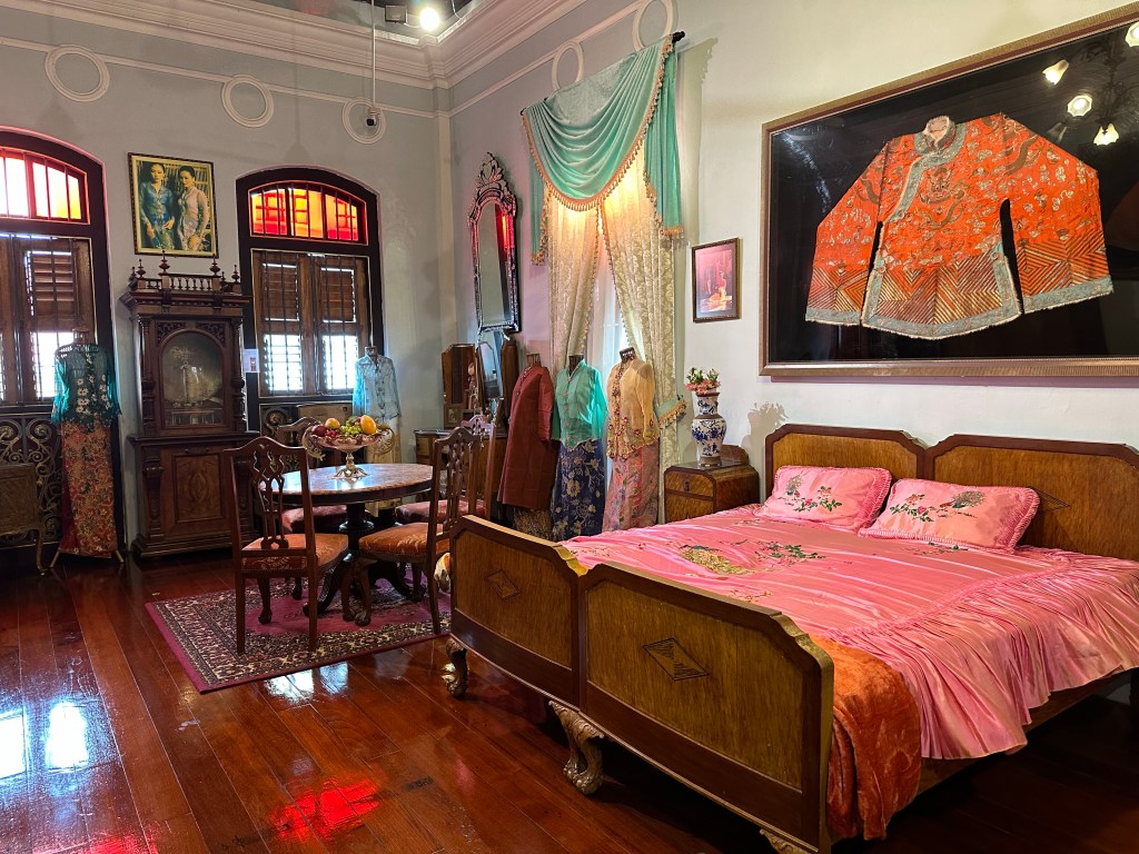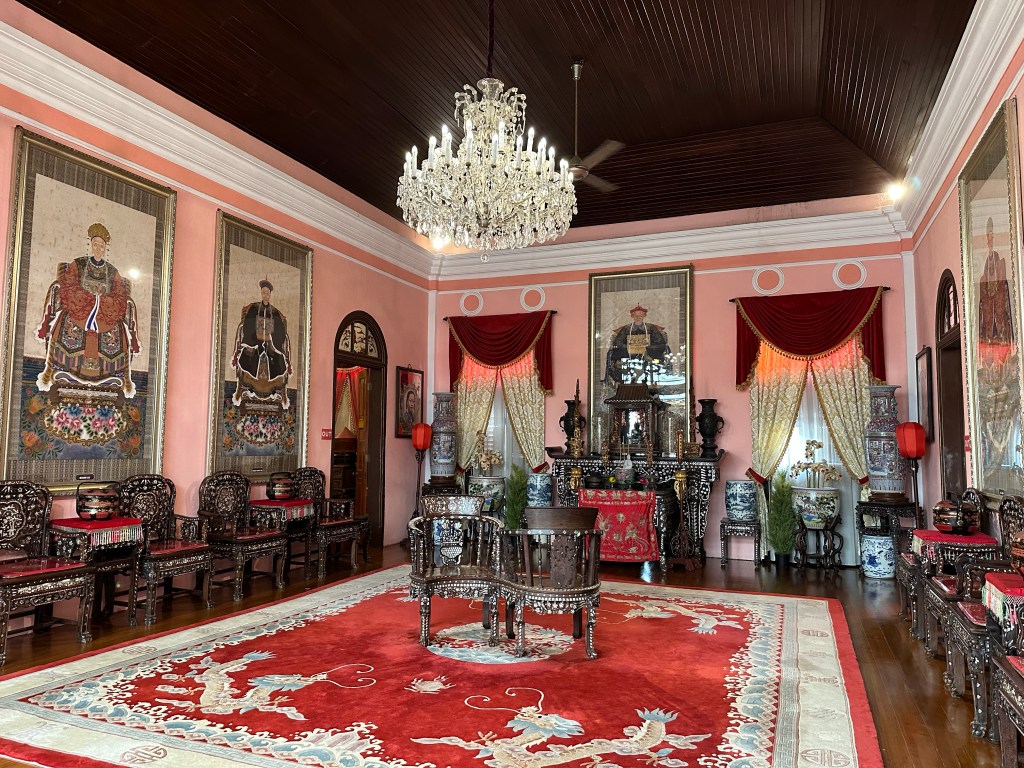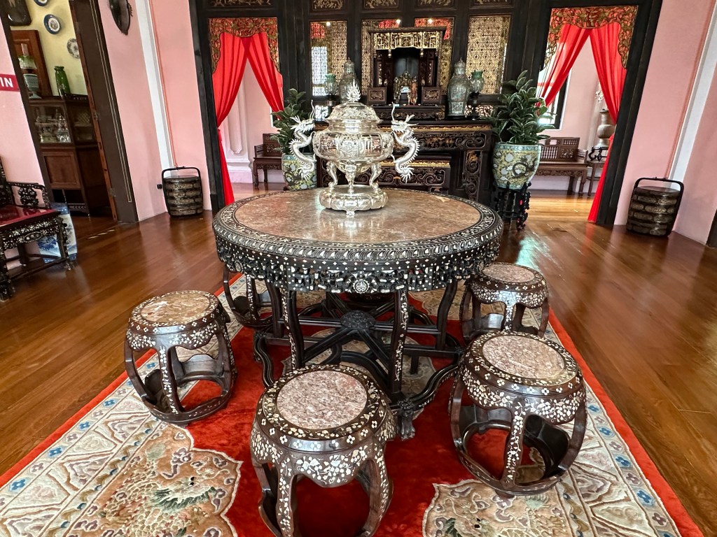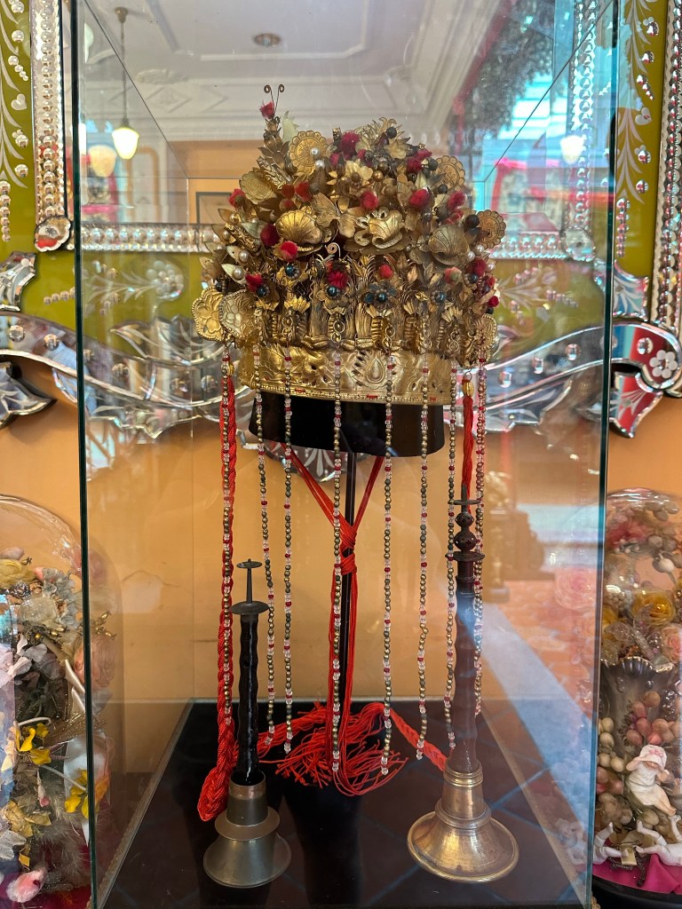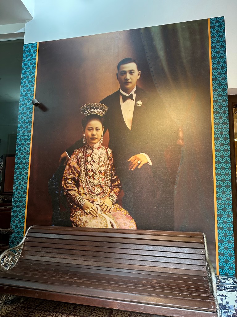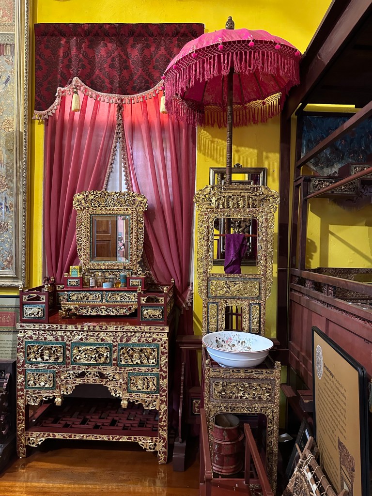 I tour the Pinang Peranakan Mansion, the 19th century mansion that is a good example of the Peranakan lifestyle. Peranakan are a distinct type of Malay. When Chinese immigrants, mostly rich, arrived in Penang they were often offered a bride of native Malay heritage, often very young. The resulting offspring are the Nyonyas (women) and Babas that you still see to referred to in the culture today. The marriages were almost always arranged and the groom could not see the bride (and vice versa) until they are to be married. The brides often wore this very heavy metal thing on their head that masked their appearance. I am glad I made it time for the tour because the guide was very descriptive on how life was back then. He even commented that polygamy was common a while ago because often the groom would not be happy with the bride chosen for him. Many native Malays are of this heritage.