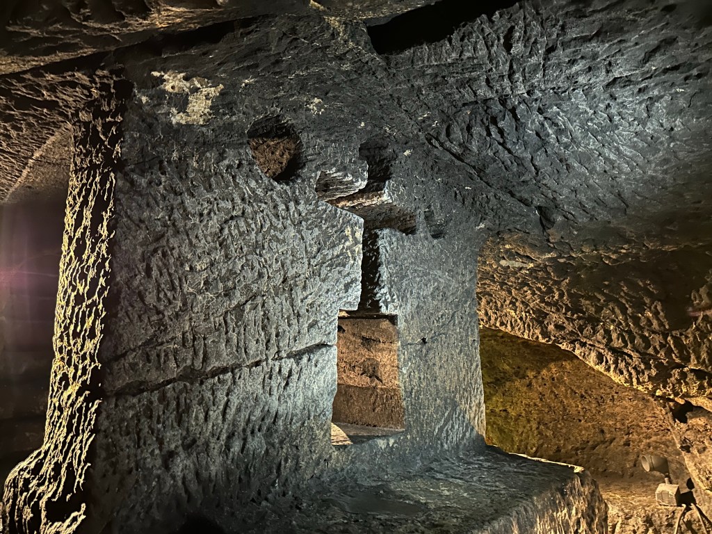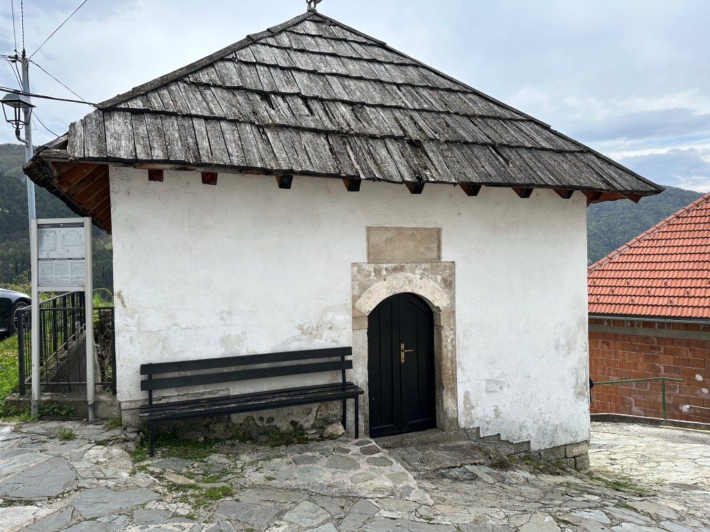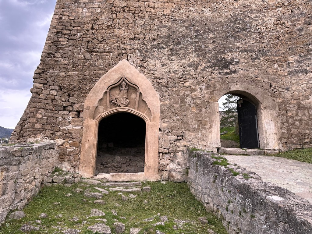 We walk down stairs to the catacombs that were never actually used for their intended purpose – to bury Hrvoje Vukcic Hrvatinic and his family. It was used as a church. Notable is the cross symbol on the lower level accompanied by the moon and the sun. These two symbols often appear in Bosnian history as they tried to mix the former pagan symbols with Christianity symbols.