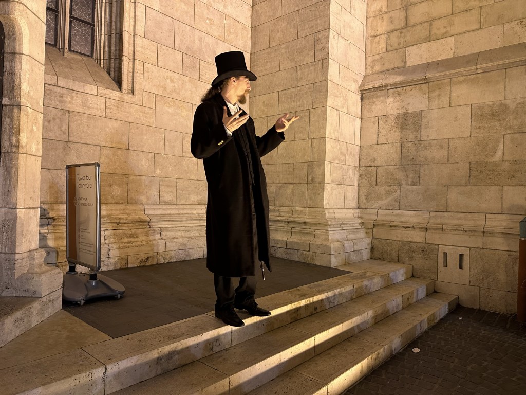 I grab my slightly charged phone and head back down the hill to meet my tour guide. We know right away it is him because of his long black coat and top hat. He gathers us then slowly takes us back up the hill telling us story after story of mostly vampires or vampire adjacent creatures in Hungary’s history. He even includes his version of the “true story” of Vlad the Impaler (Dracula). He is a good story teller and I enjoy seeing Buda all lit up for the evening.