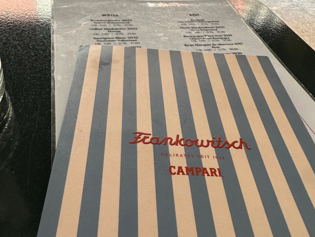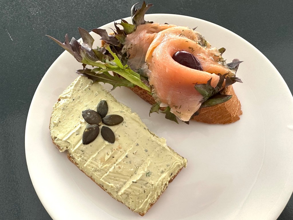 I stop at the Frankowitsch – Brötchenbar – Delikatessen to try their open face sandwiches for lunch. They are good. I love the spread on the sandwich Pumpkin seed oil. I also order a lox one because I love salmon.