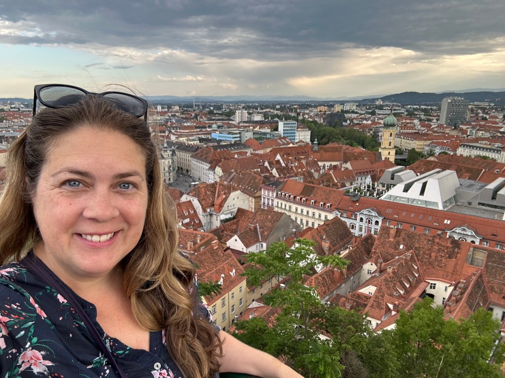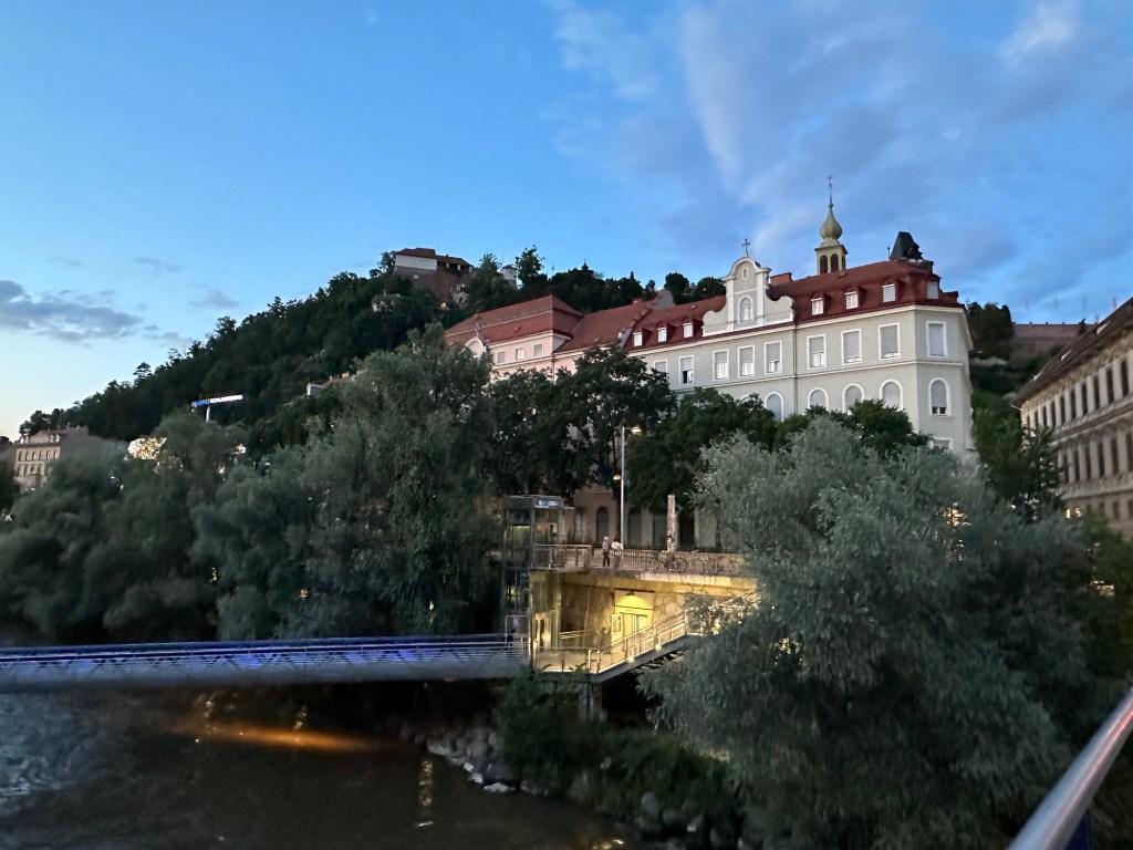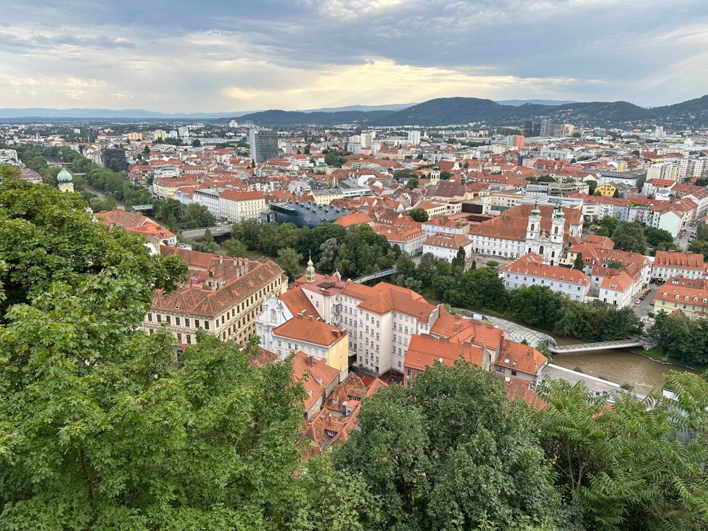 After lunch I take the train up to Schlossberg the tall mountain area that overhangs into the town. I enjoy some great views from up there. I slowly walk down from level to level and finally get to those intimidating stairs. I am sweating just going down so I am not sure I would really enjoy going up this time of year but lots of other people are doing it.