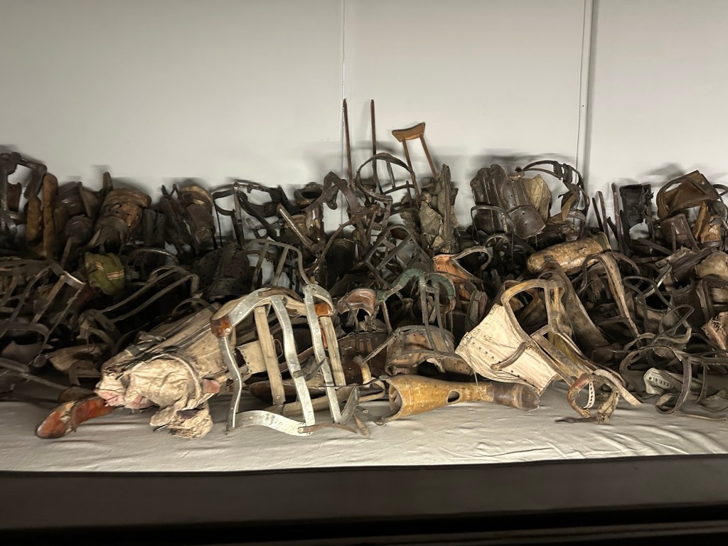 There are displays of cases filled with women’s hair (they would cut off and sell women’s hair), shoes, prosthetic body parts, and luggage among other things.