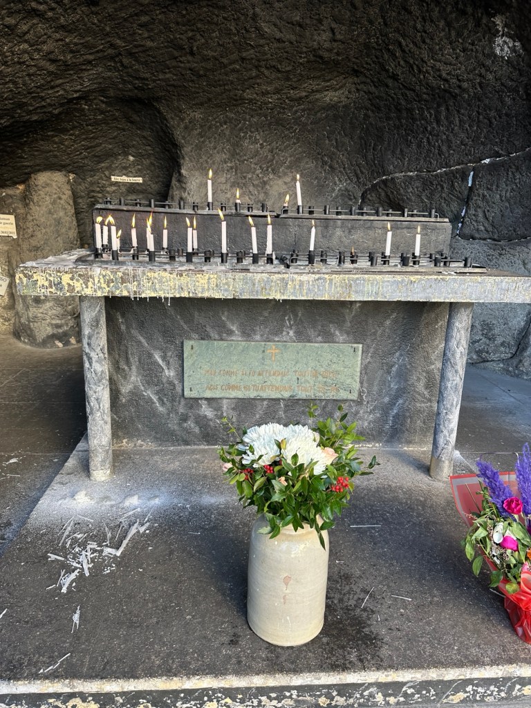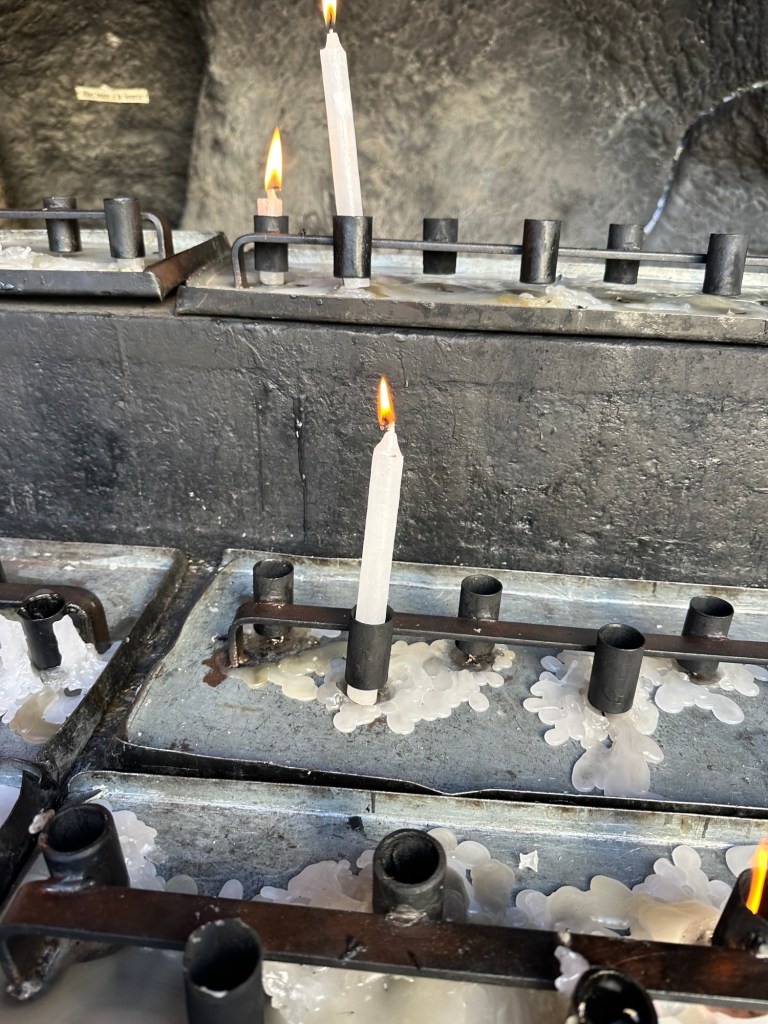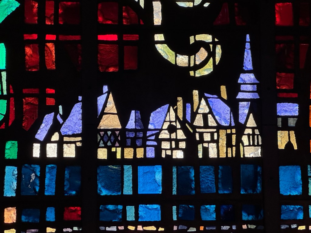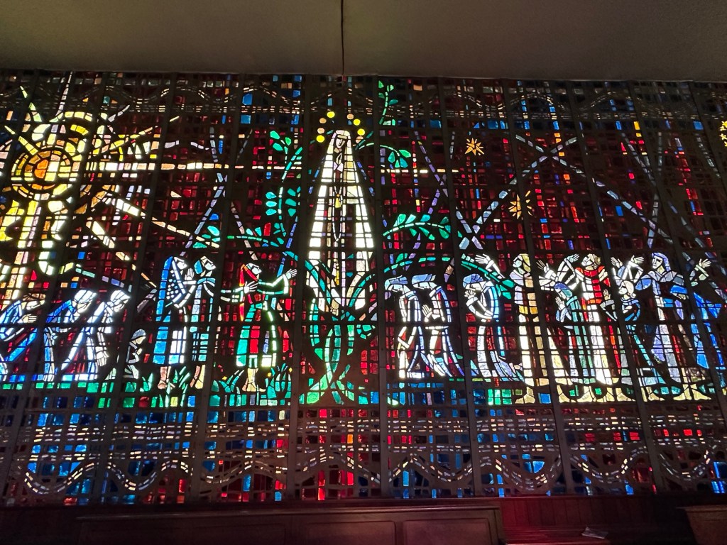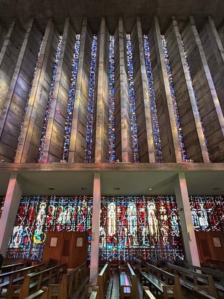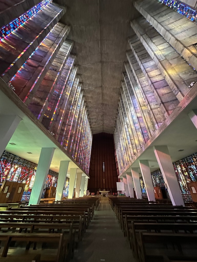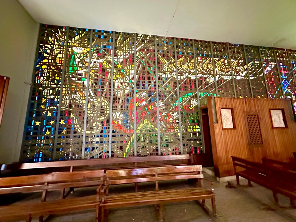 We revisit the Church of Notre Dame of Lourdes to view it since there is now no service. The amazing stain glass windows cast beautiful colors along the sides of the church.