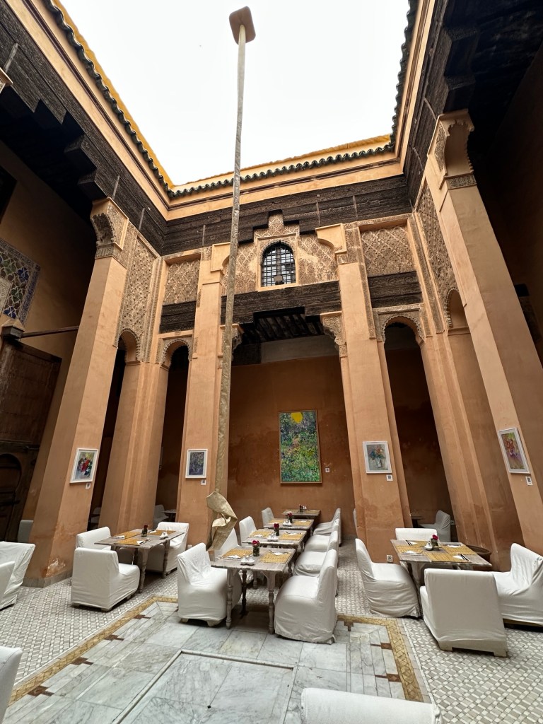 We arrive at Marrakech in the afternoon. The long winding drive has many on our tour exhausted but there are still some hours of daylight left today; plus there is a threat of rain the rest of our travels so it’s best to take advantage of today for seeing the city. My travel companion and I grab a taxi to the Medina. We have a struggle at first obtaining a taxi but somehow we end up in a taxi share situation where a very nice man in the passenger seat used to live in a city two hours from where we are from agrees to share a taxi with us. I missed the transaction happening but he pays for the taxi ride for us when he gets out of the cab.