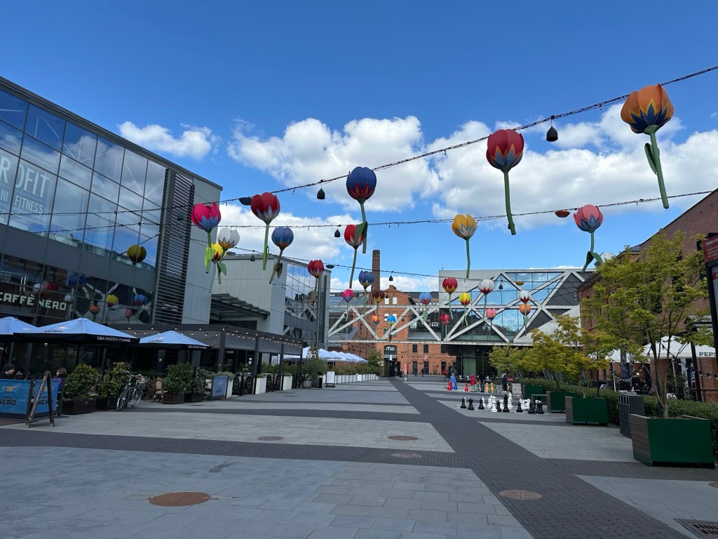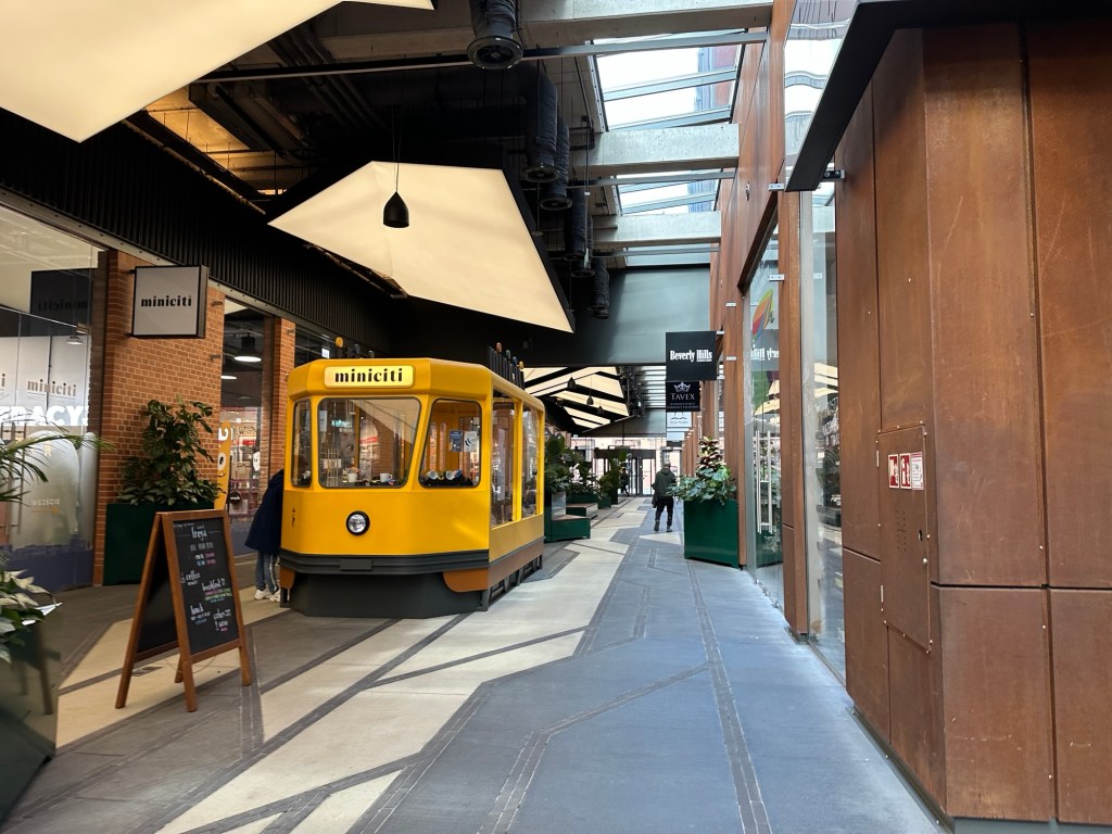 We walk down a passage way that is decorated with random items. We watch some kids kick a ball around. It appears to be a pop up art installation in the middle of a residential street.