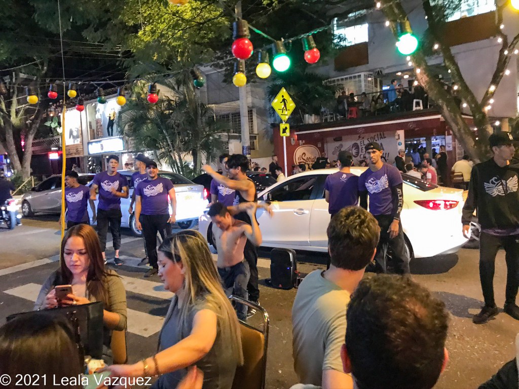 We walk down the street to where the fans of “our” team is hanging out. It is lively but much less crowded.