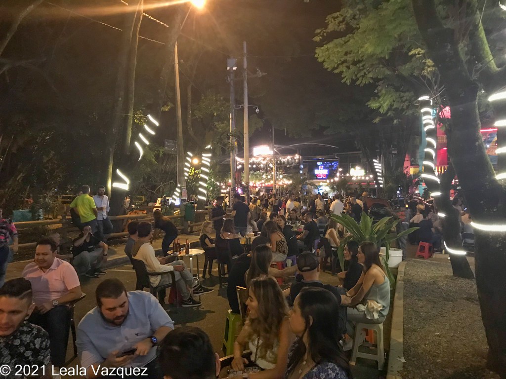 We start in the very crowded tailgate area of Atlético Nacional . We are wearing the jersey for the opponent but no one cares. No heckling or anything happens.