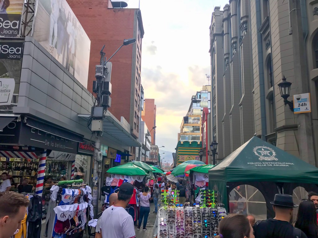 After the parade we are still having a hard time finding decent looking shirts for the underdog team (Independiente MedellÃn). It seems people only want to buy shirts for the better team so that is most of what we see. The knockoffs are pretty terrible, some not even the current year design. We eventually find some that are satisfactory. After our shirt purchases we head to a shop where I find a bum bag. It is black but it is obvious that I am buying a bag that was given away free at some tech conference and now is being sold in this shop. It is a rip off but I need something small to carry my items to the match so this will do.