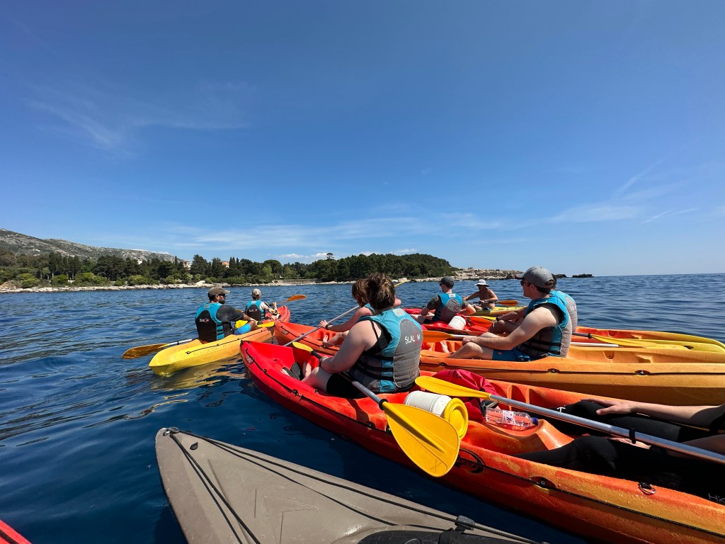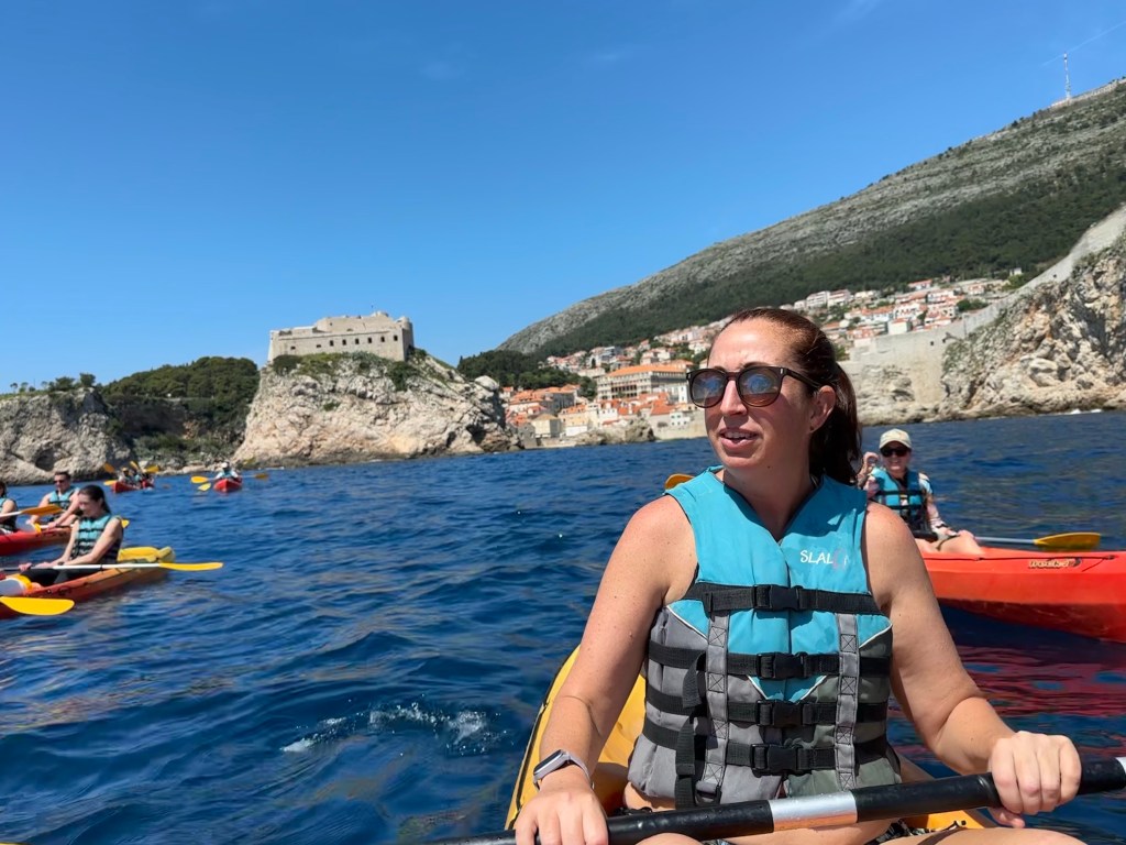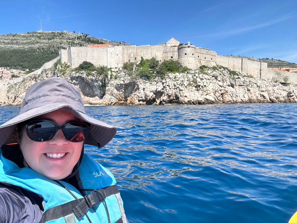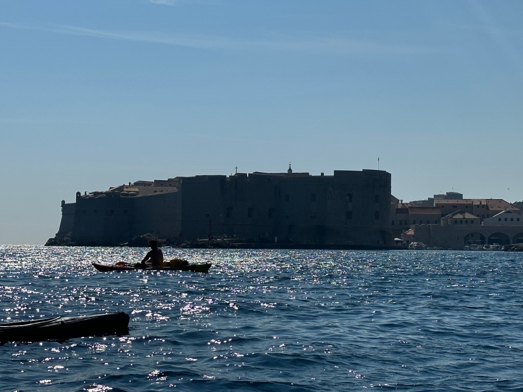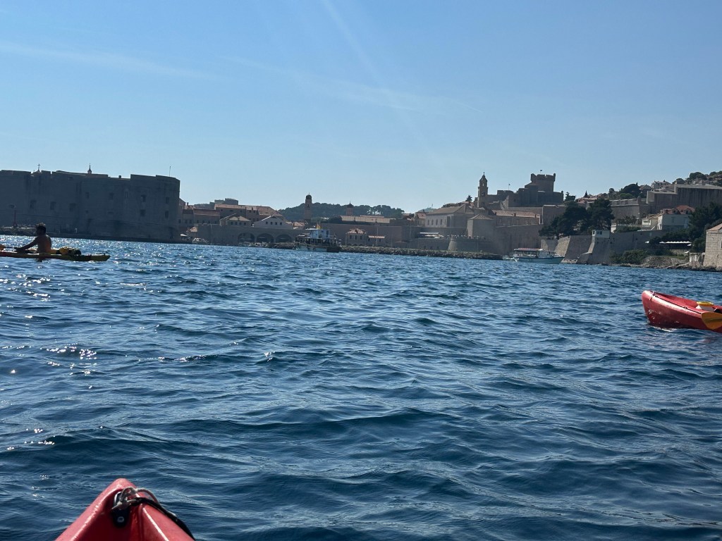 It’s finally time for our kayaking tour so we head out. We are both are experienced kayakers but I’ve only been ocean kayaking a little. We decide its for the best that she’s in the back of our tandem kayak since she the more experienced out of the two of us. Initially the tour is nice and easy. The guides decide to split the group into two: one for a shorter route and one for a longer route of about 8km. We decide on the longer route that takes us around the island of Lokrum. As we paddle toward the island we look back to admire the walls of the city.