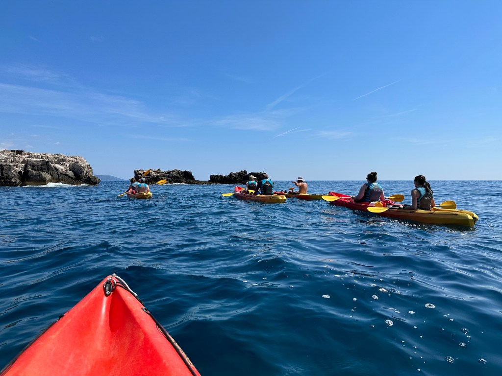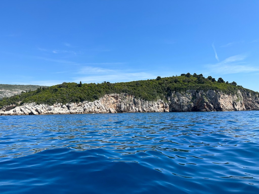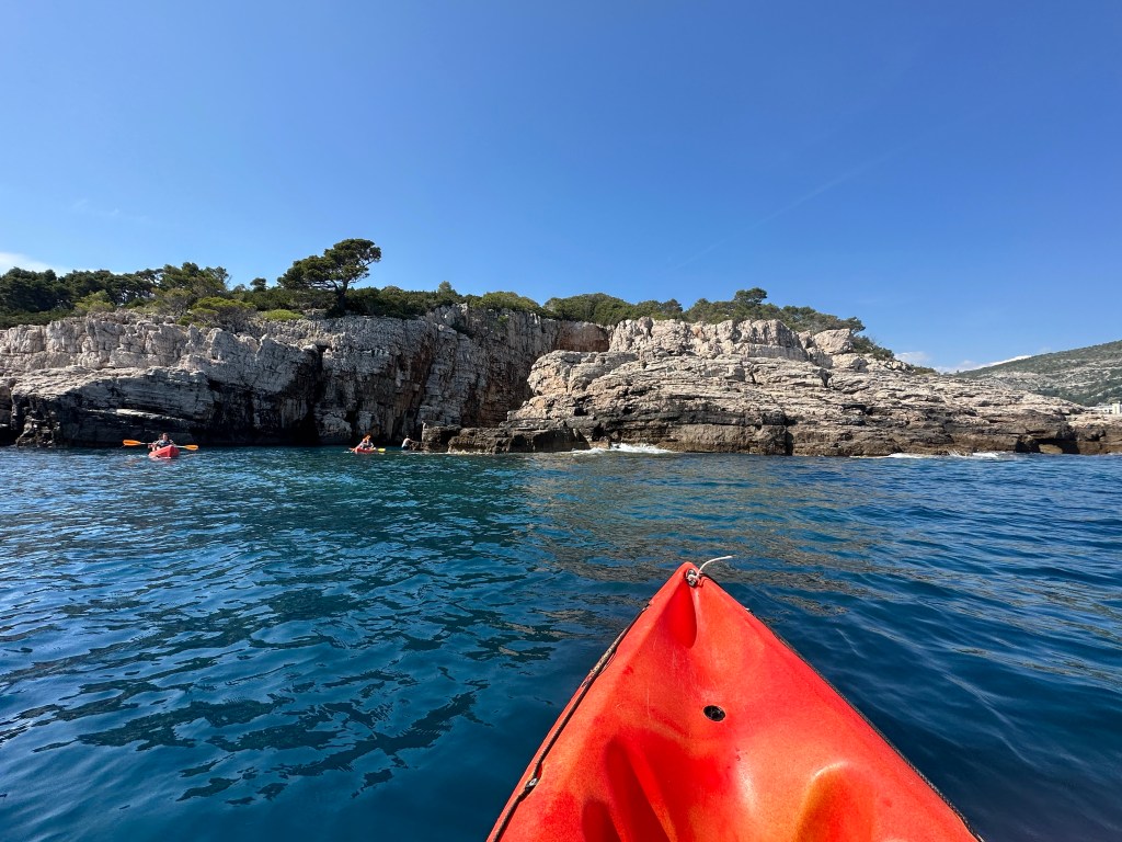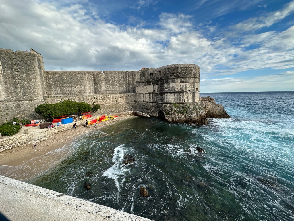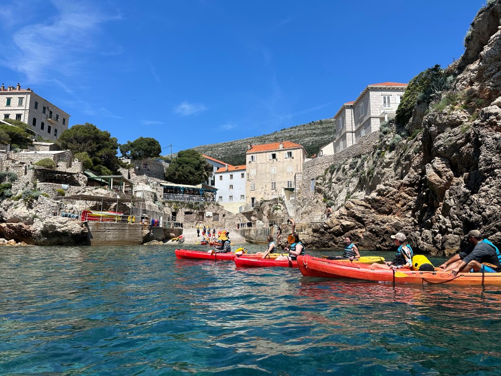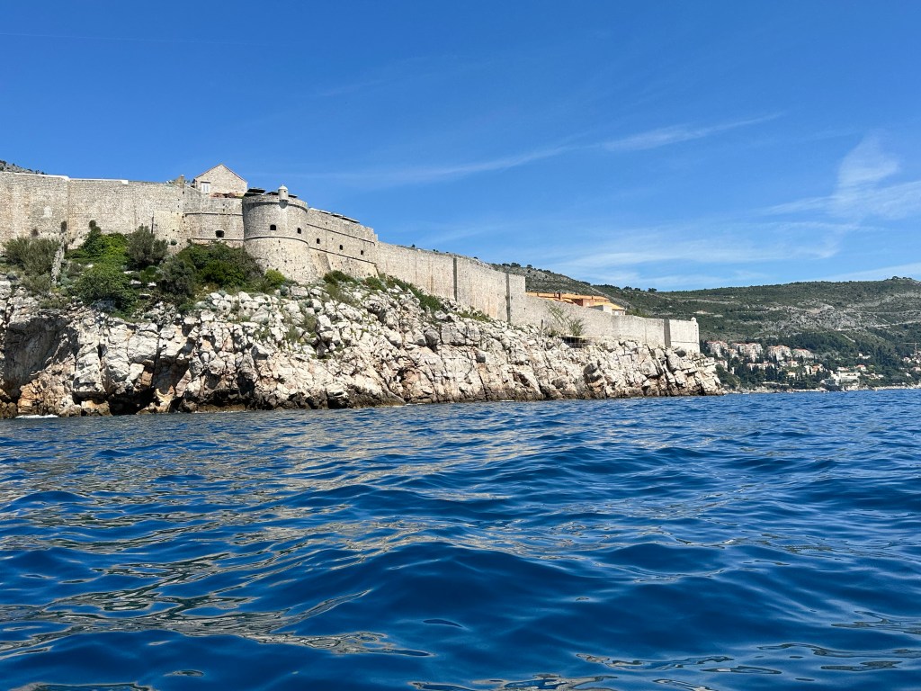 It’s finally time for our kayaking tour so we head out. We are both are experienced kayakers but I’ve only been ocean kayaking a little. We decide its for the best that she’s in the back of our tandem kayak since she the more experienced out of the two of us. Initially the tour is nice and easy. The guides decide to split the group into two: one for a shorter route and one for a longer route of about 8km. We decide on the longer route that takes us around the island of Lokrum. As we paddle toward the island we look back to admire the walls of the city.