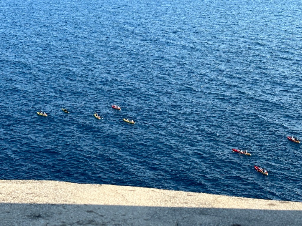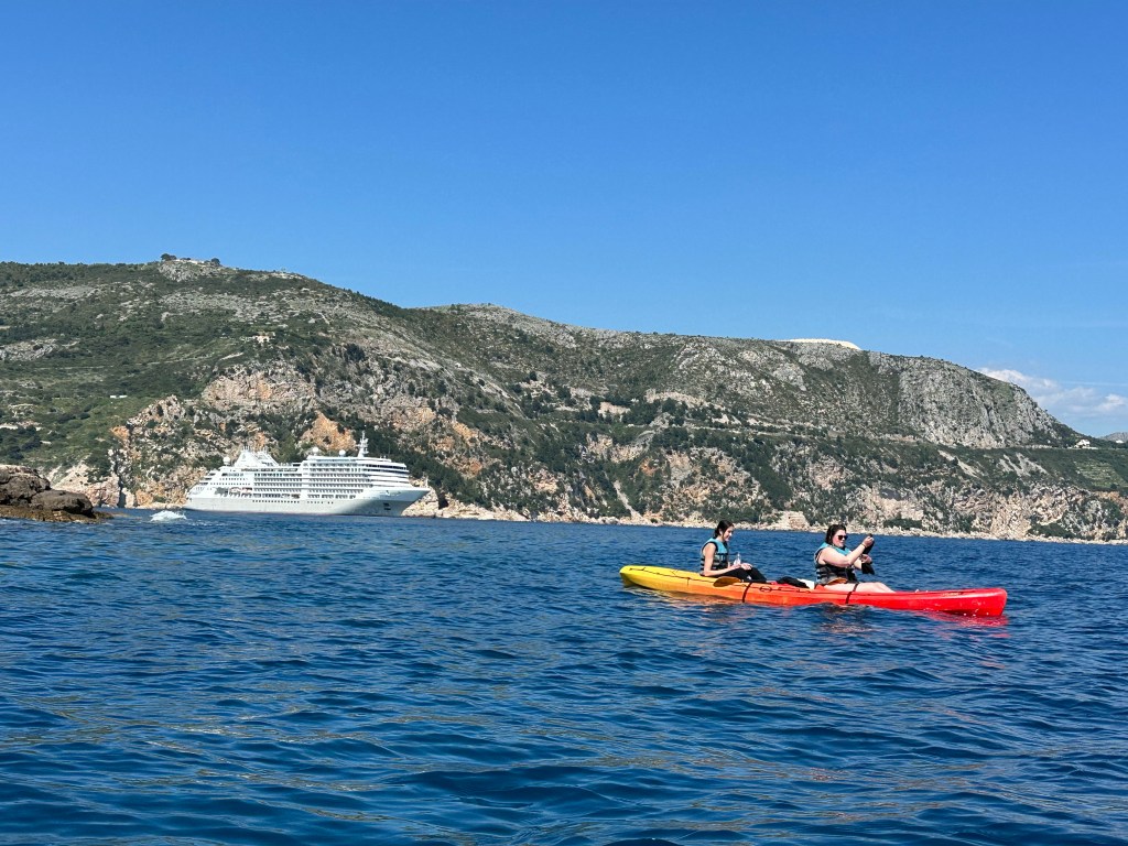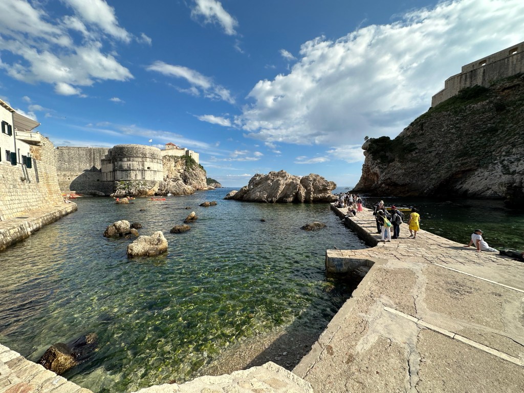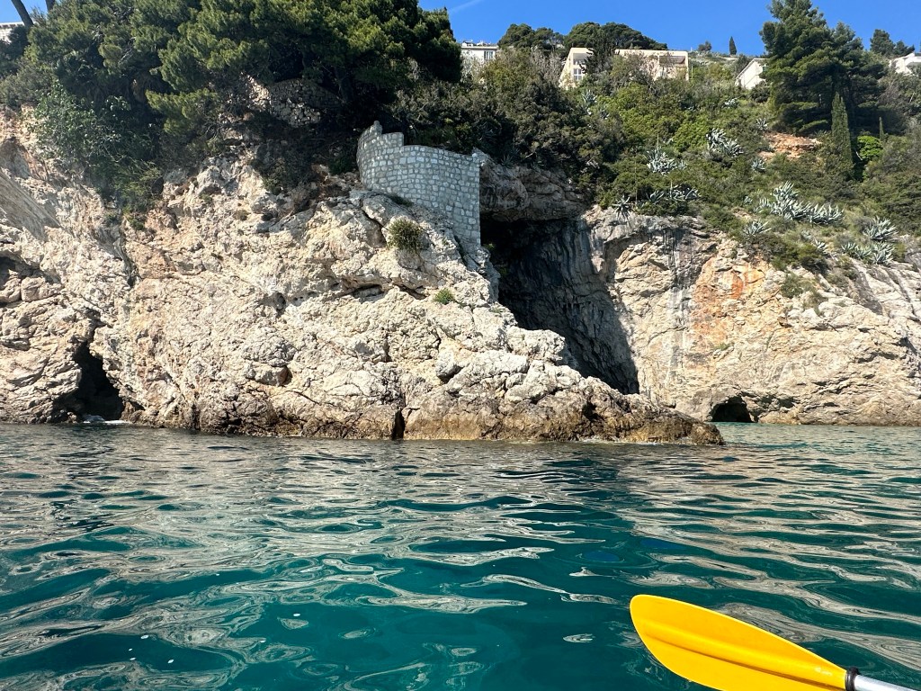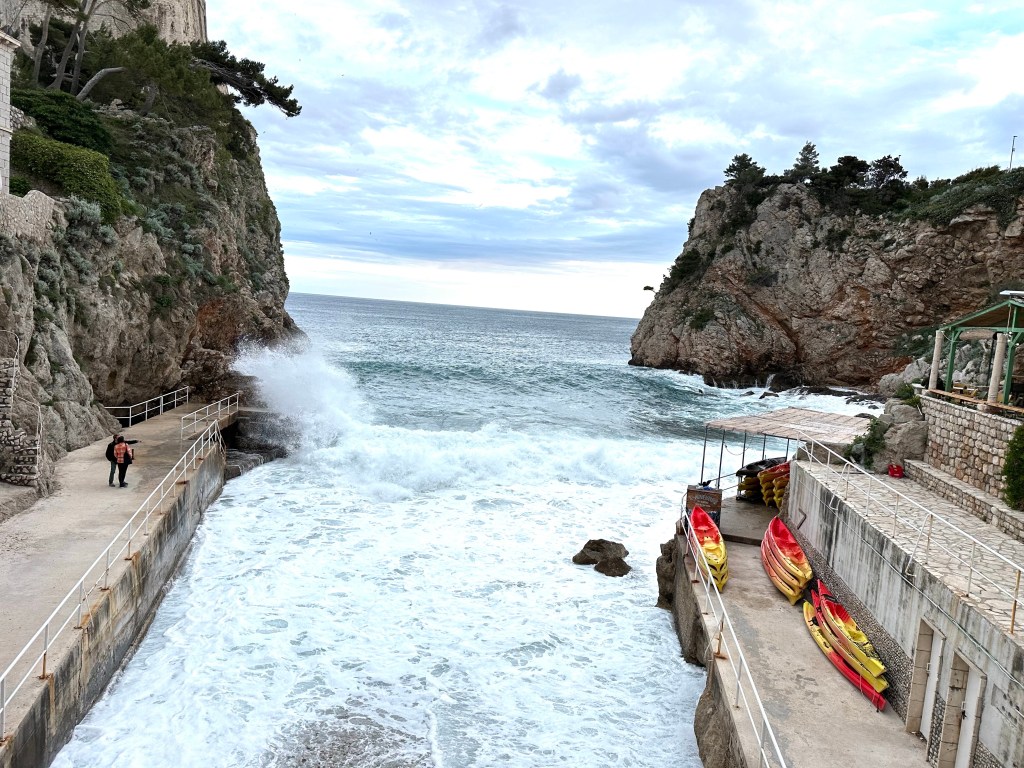 It’s finally time for our kayaking tour so we head out. We are both are experienced kayakers but I’ve only been ocean kayaking a little. We decide its for the best that she’s in the back of our tandem kayak since she the more experienced out of the two of us. Initially the tour is nice and easy. The guides decide to split the group into two: one for a shorter route and one for a longer route of about 8km. We decide on the longer route that takes us around the island of Lokrum. As we paddle toward the island we look back to admire the walls of the city.