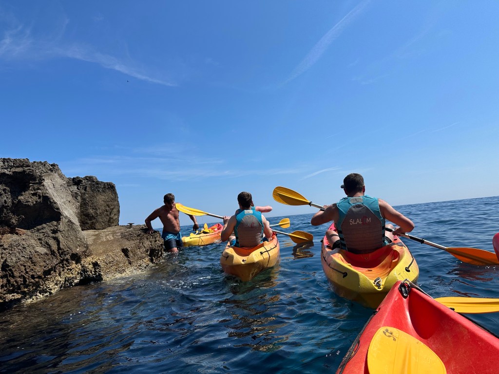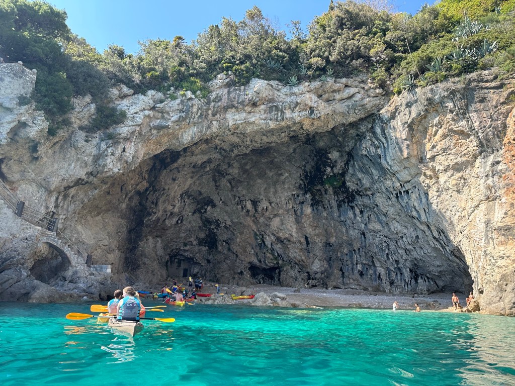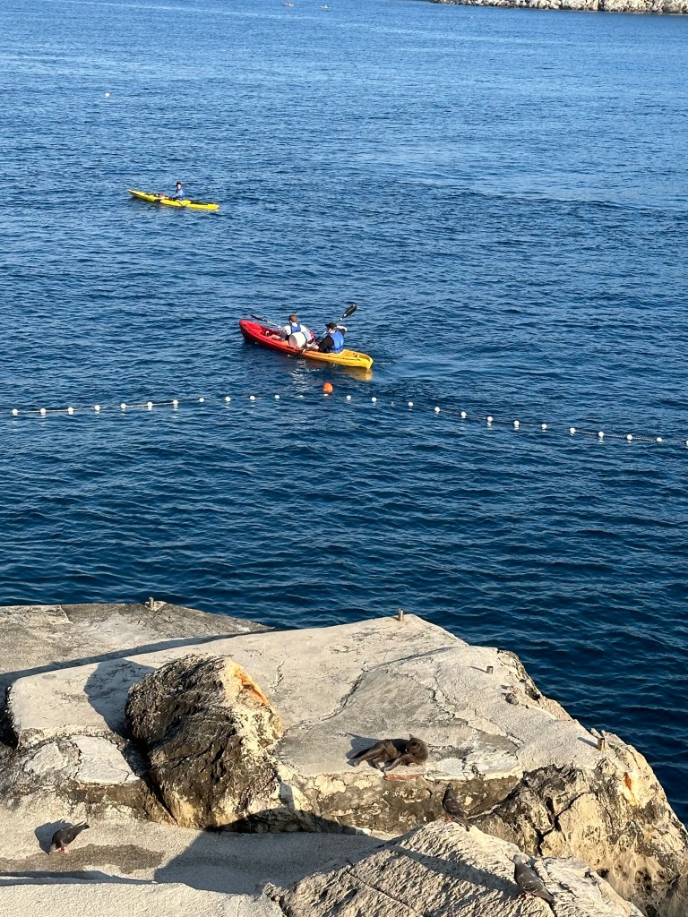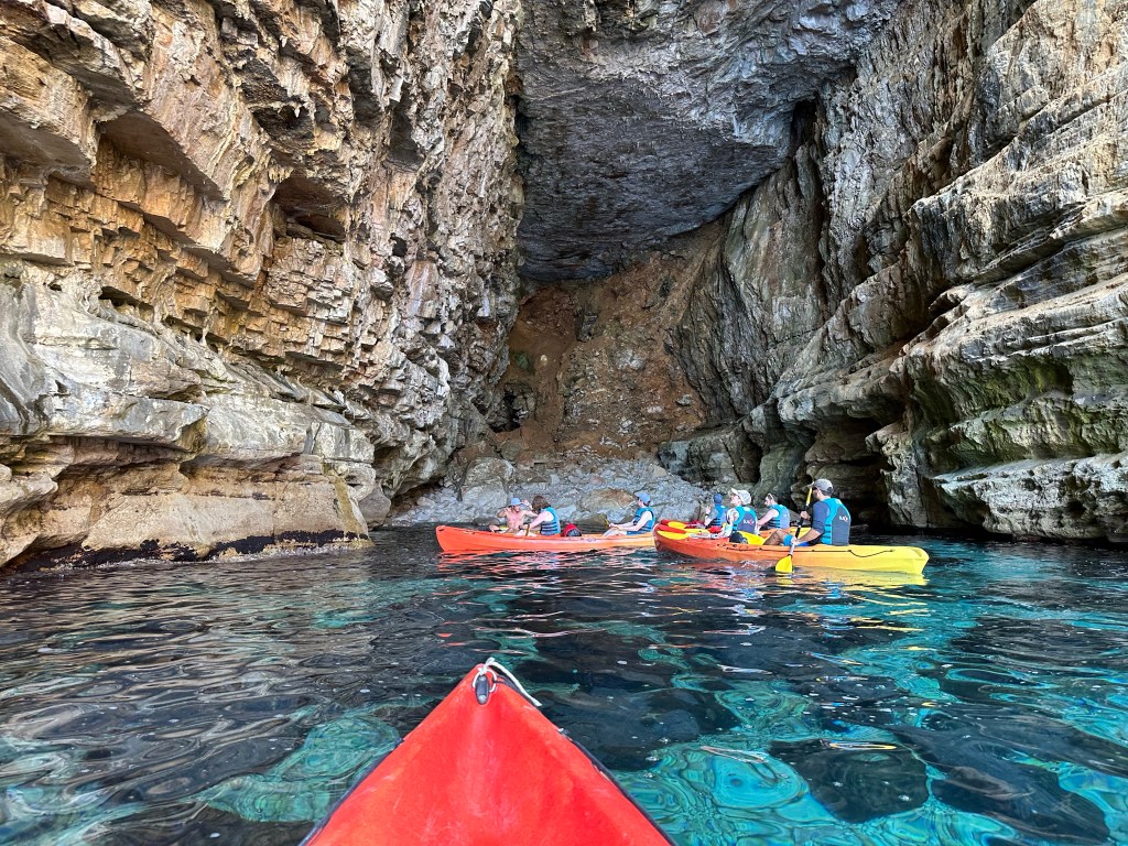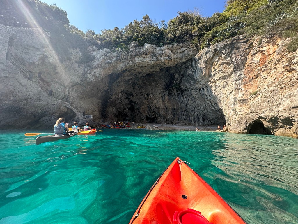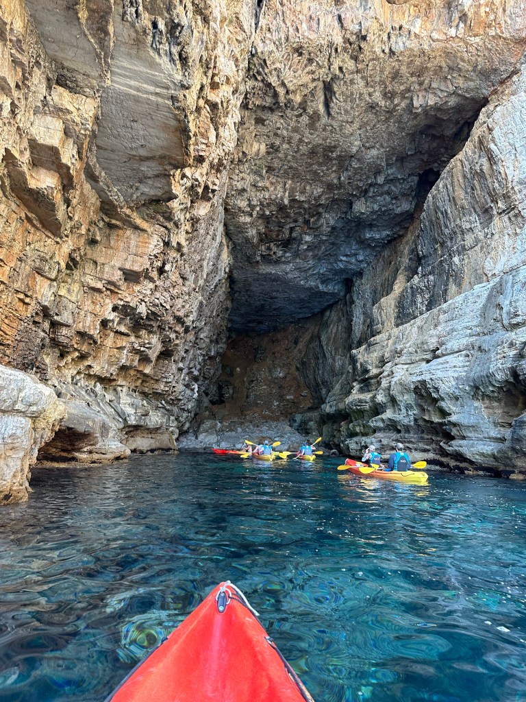 The guide loads us back into our kayaks 2 by two and we head out a bit to wait and a quick look to the left gives us the vision of at least 3 naked men sunning on the rocks. Yes we were warned about this but it is no less jolting than seeing it for yourself. We giggle and make jokes about wieners and balls because we have the sense of humor of ten year old boys. Now it is time to paddle to the next cave for a little rest and swim.