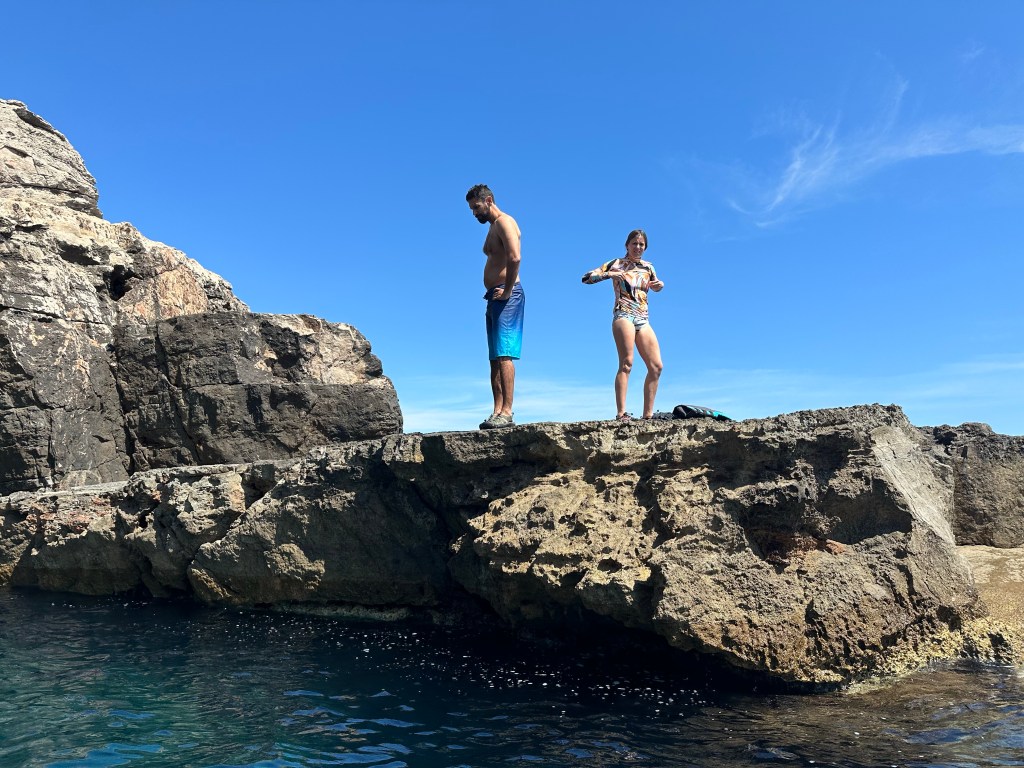 We paddle around the island and reach a cave. Right outside the cave there is a ledge where we are to attempt a cliff dive. I plan on skipping the cliff dive but it seems the rest of the group is doing it so I guess I must too. The only problem is climbing up on the rock initially; between the sharp edges and the slippery parts I am a mess but with help I get up. There are two jumps to do, the high jump and the lower jump. The lower jump is high enough for me. I eventually do my jump into the very cold water and hang around on the lower rocks while I wait for everyone to finish their jumps – there is no way I am going to attempt to climb back up. The girls with wetsuits have it much better since they easily climb the rocks. I could have shimmied my way up if I had something protecting my body from the sharpness of the rocks.