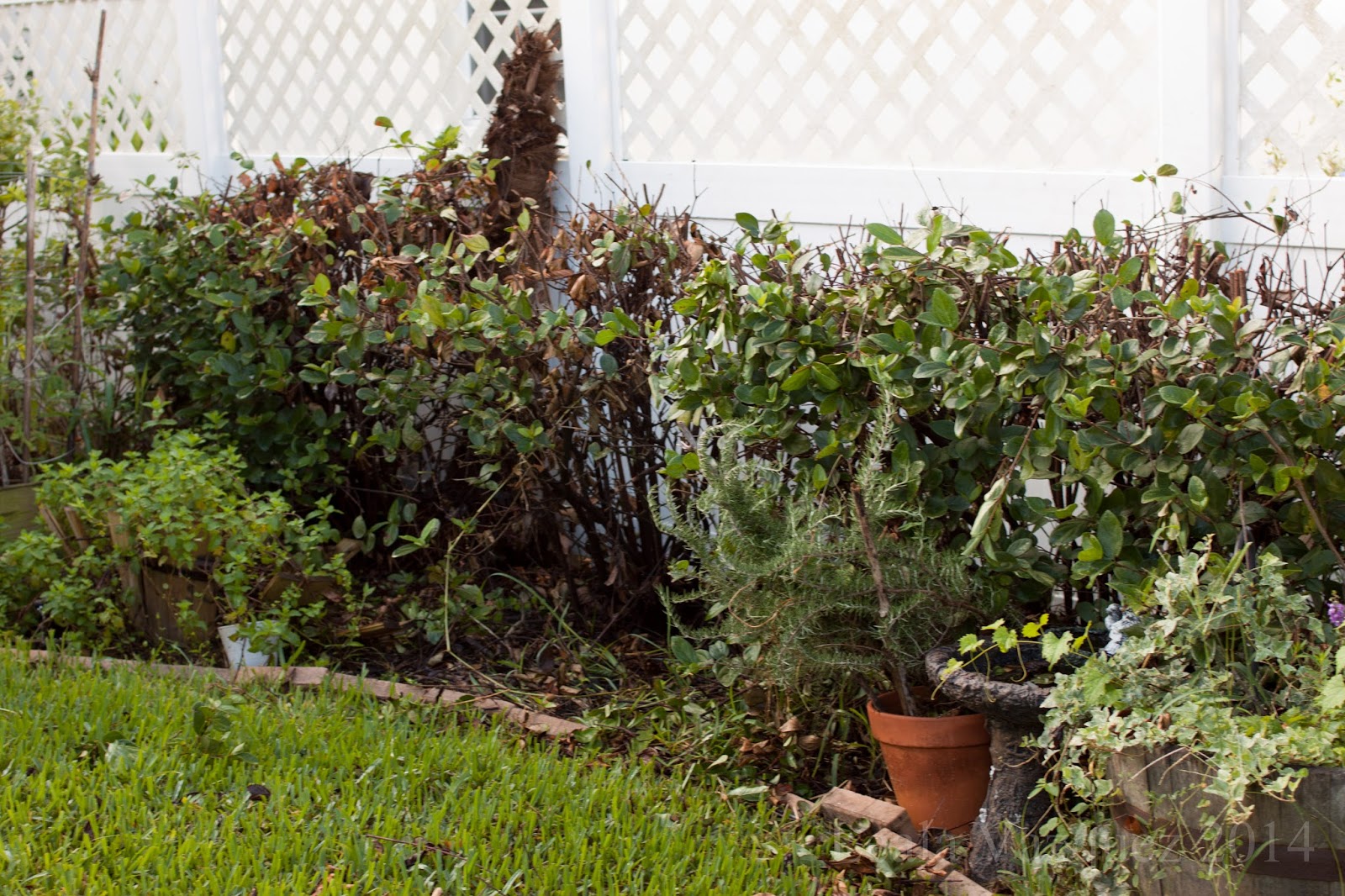 I butchered the heck out of the viburnum in the backyard. I was trying to locate a lost sprinkler head and finally found it behind the middle bush. I will be replacing that sprinkler head with drip irrigation to provide better water to one of the square foot gardens. I would like to train the bush on the right to grow as a small shade tree to open that area for some shade plant opportunities…..we will see what happens.