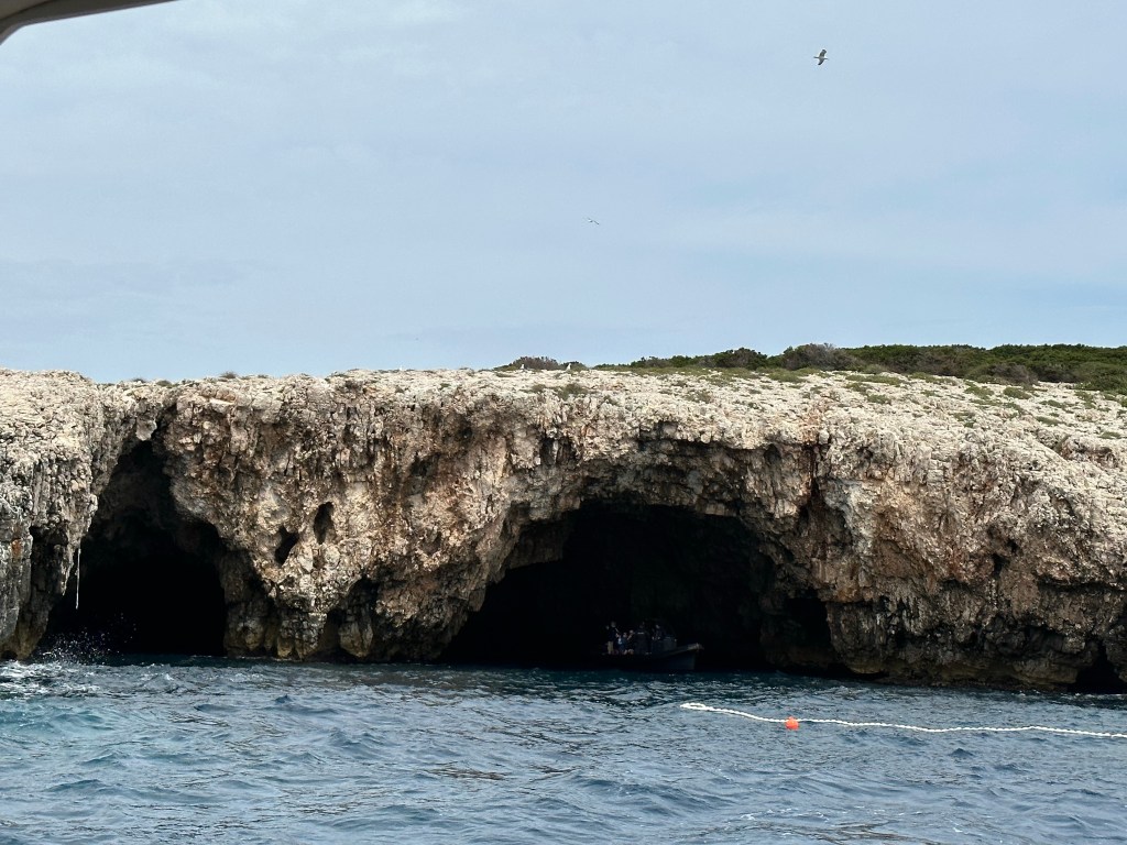They split the passengers into two boats and while I am initially sad we are to go in the small red boat, but I quickly realize I am with the fun group and it makes the tour much more enjoyable. First its about a thirty minute ride out and then we ride along and admire the coast of another island. Due to it being a choppy day, no one is manning and collecting money for the green cave so our adept captain takes our entire boat inside to enjoy. Due to the seas being rough we are unable to swim inside today though.