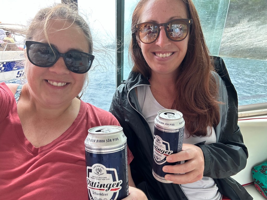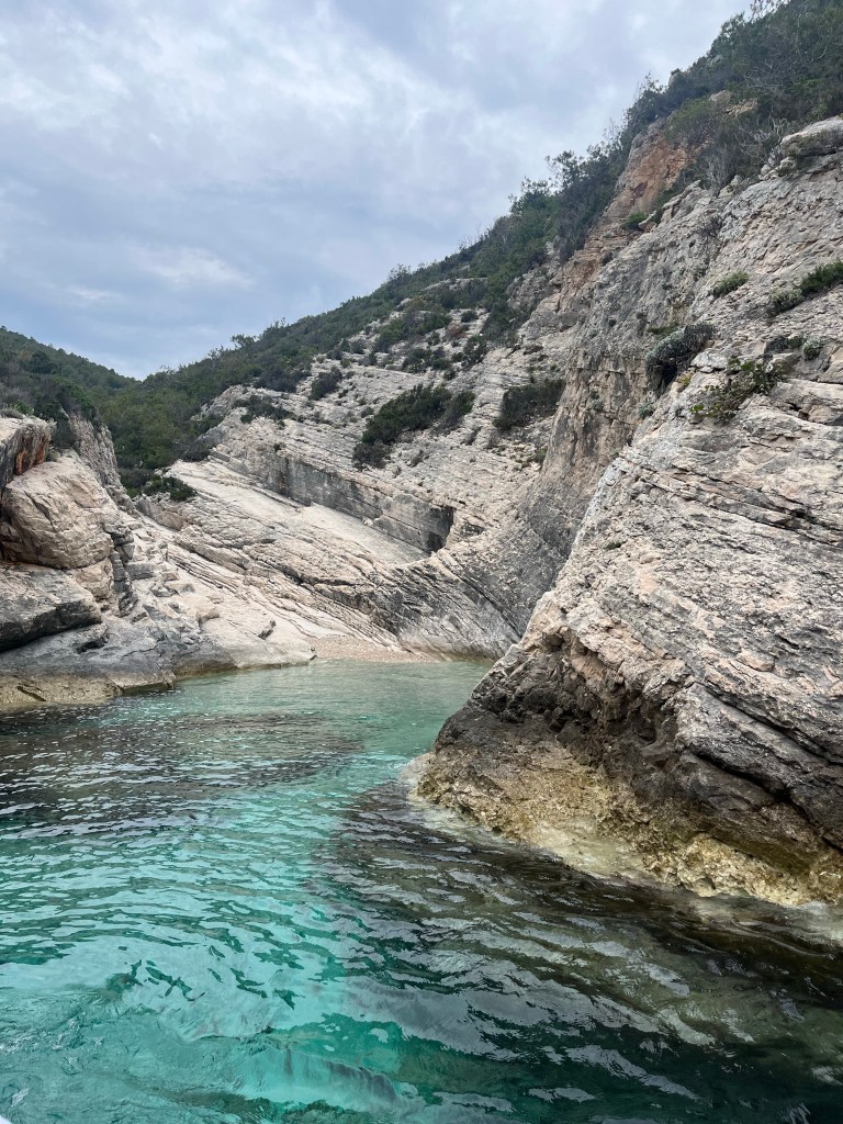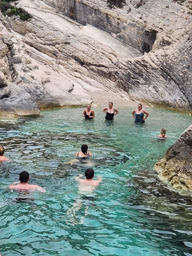 Our next stop is a small secluded beach only accessed by boat or by a steep trail. It was used in the second Mamma Mia movie. Our guide tells us we can swim out to the beach but only one is brave enough for a swim since the water is cold and it is early. We all resolve to watch the beach from the distance until the solo bartender on the beach waves us down and comes out with a small boat to taxi us over. Luckily we all get a better view from inside the beach. We are sure to purchase some beers from him for his kindness.