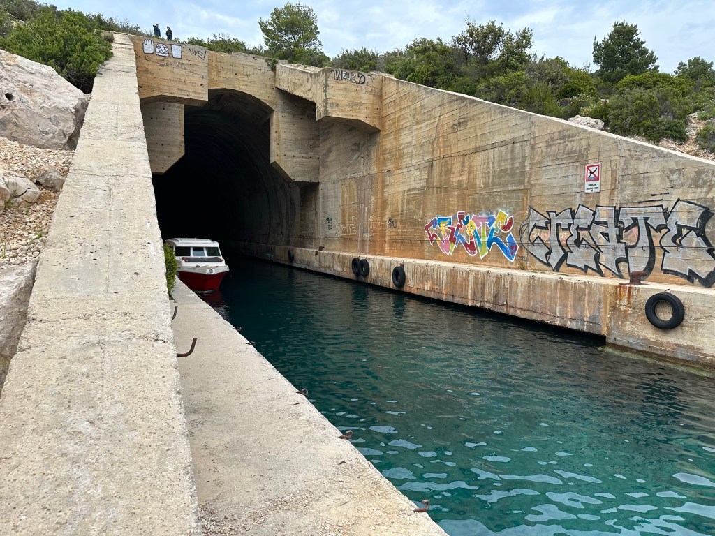 Finally we stop at a Cold War submarine cave at Vis. We get off the boat and walk through a tunnel.