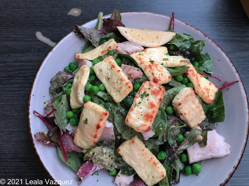 My last meal in New Zealand is a salad – I am craving Halloumi once more but this salad grosses me out since the chicken looks and has texture like it is undercooked. The café insists the chicken is fine but it grosses me out.